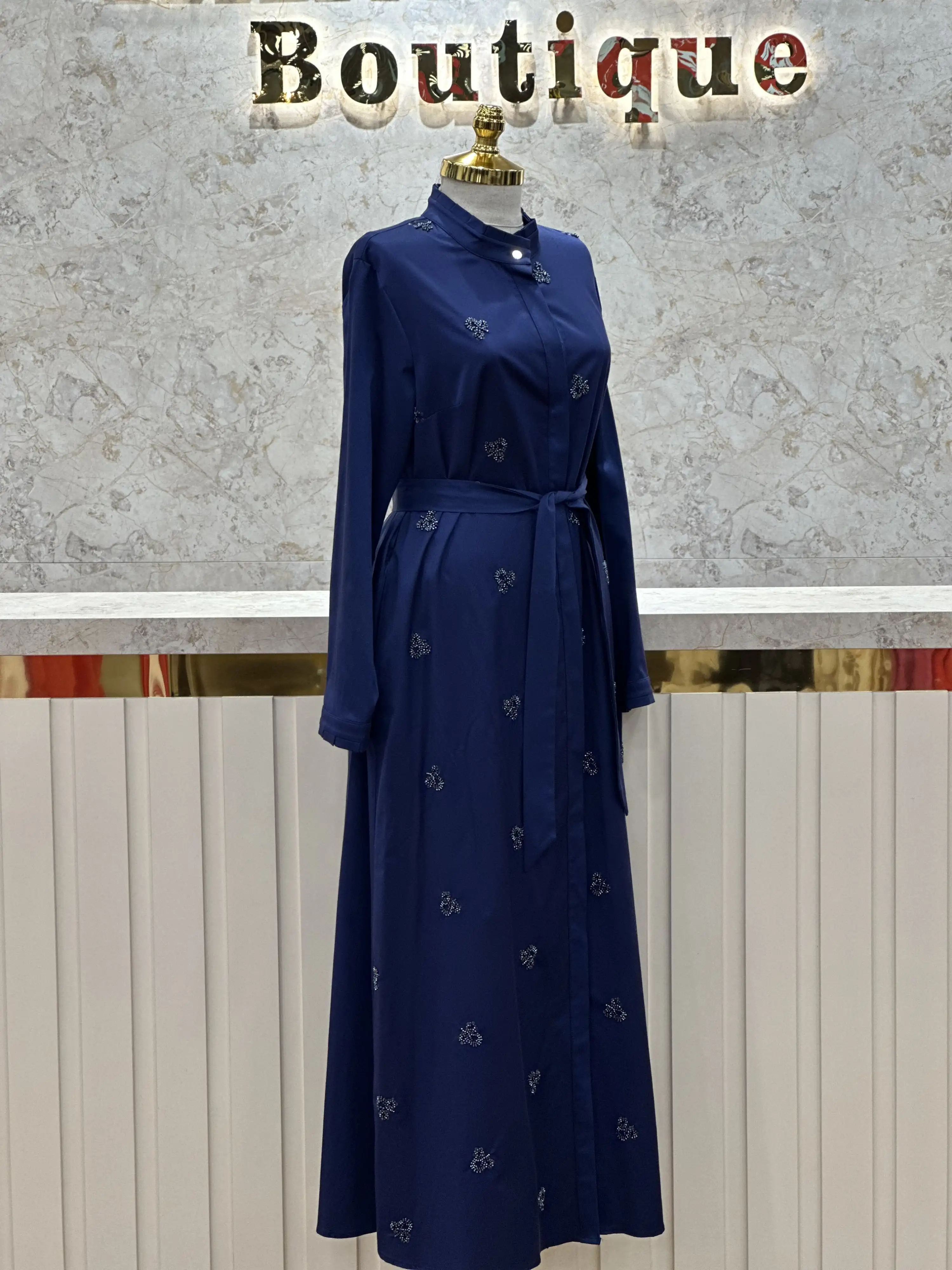 Bu muhteşem lacivert renk elbise, tesettür giyimde zarafet ve şıklığı bir araya getiriyor. Markasız olmasına rağmen kalitesi ve şıklığı ile ön plana çıkan bu elbise, her tarza ve vücut tipine uyum sağlıyor.