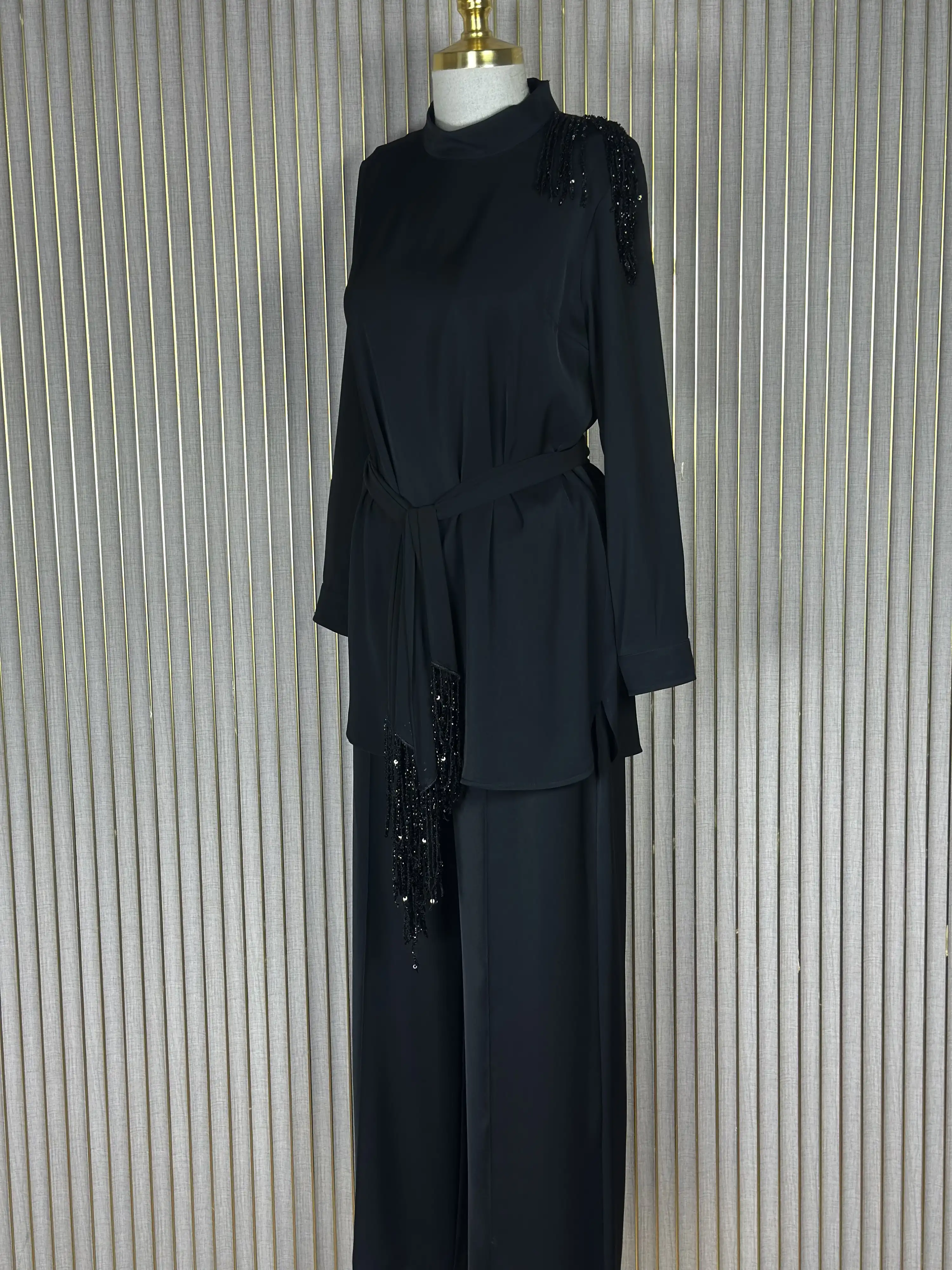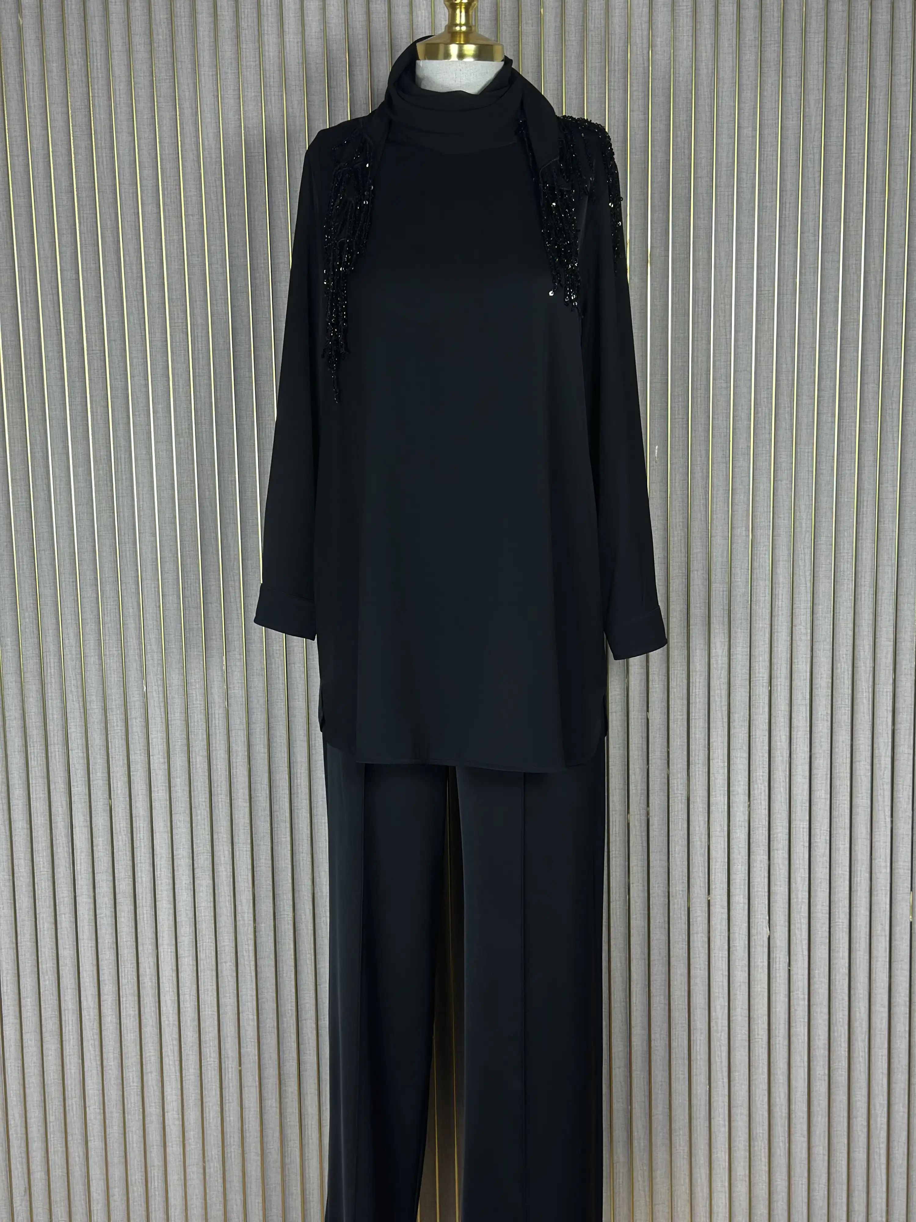 Bu siyah renk takım, tarzınıza şıklık katmak için ideal bir seçenektir. Hem günlük giyimde hem de özel günlerde rahatlıkla kullanabileceğiniz bu takım, şıklığı ve rahatlığı bir arada sunar.