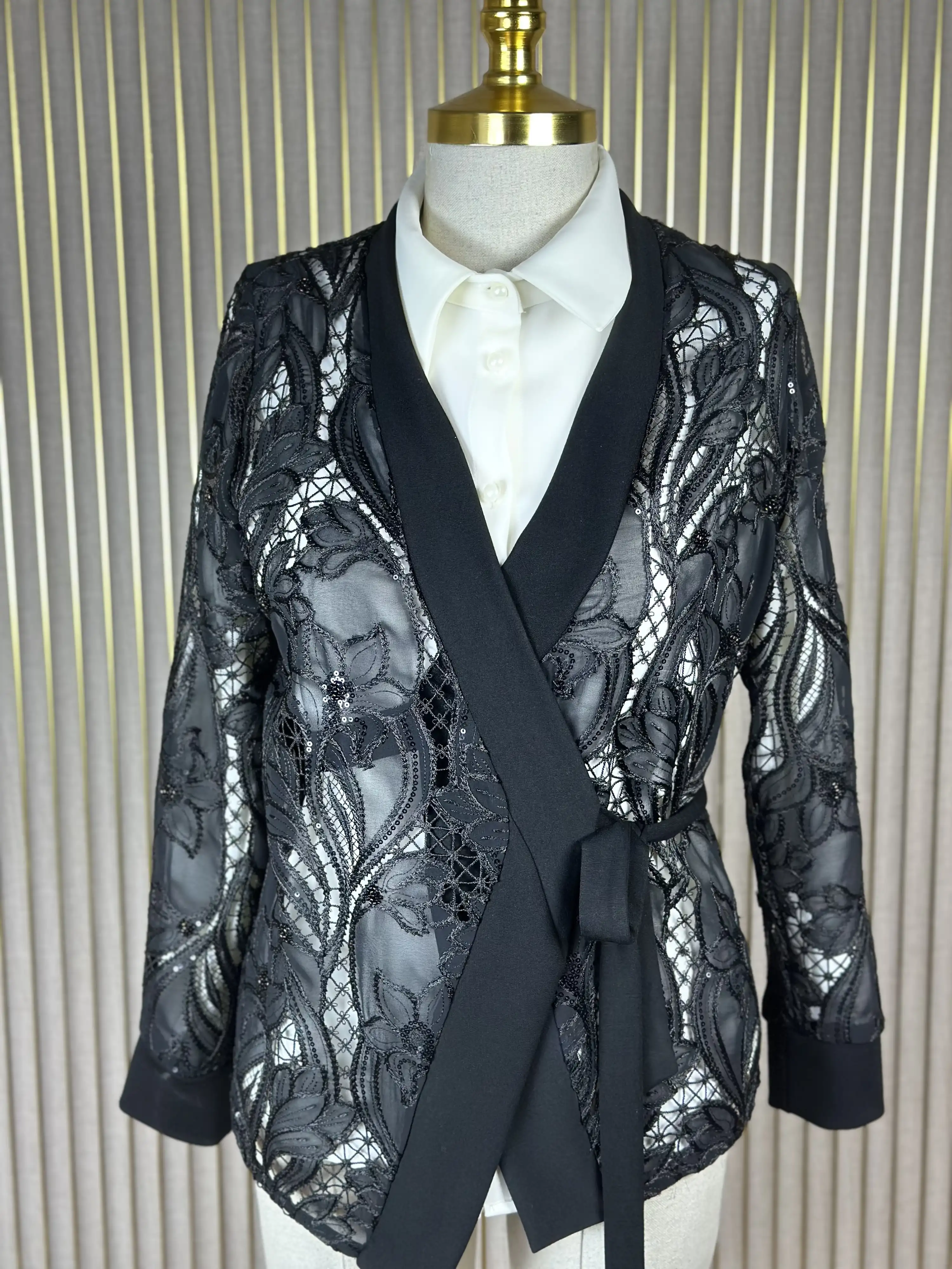 • Dış: Dantel görünümlü siyah ceket, önde bağlama detayı ve ince işlenmiş desenlerle modern bir dokunuş.