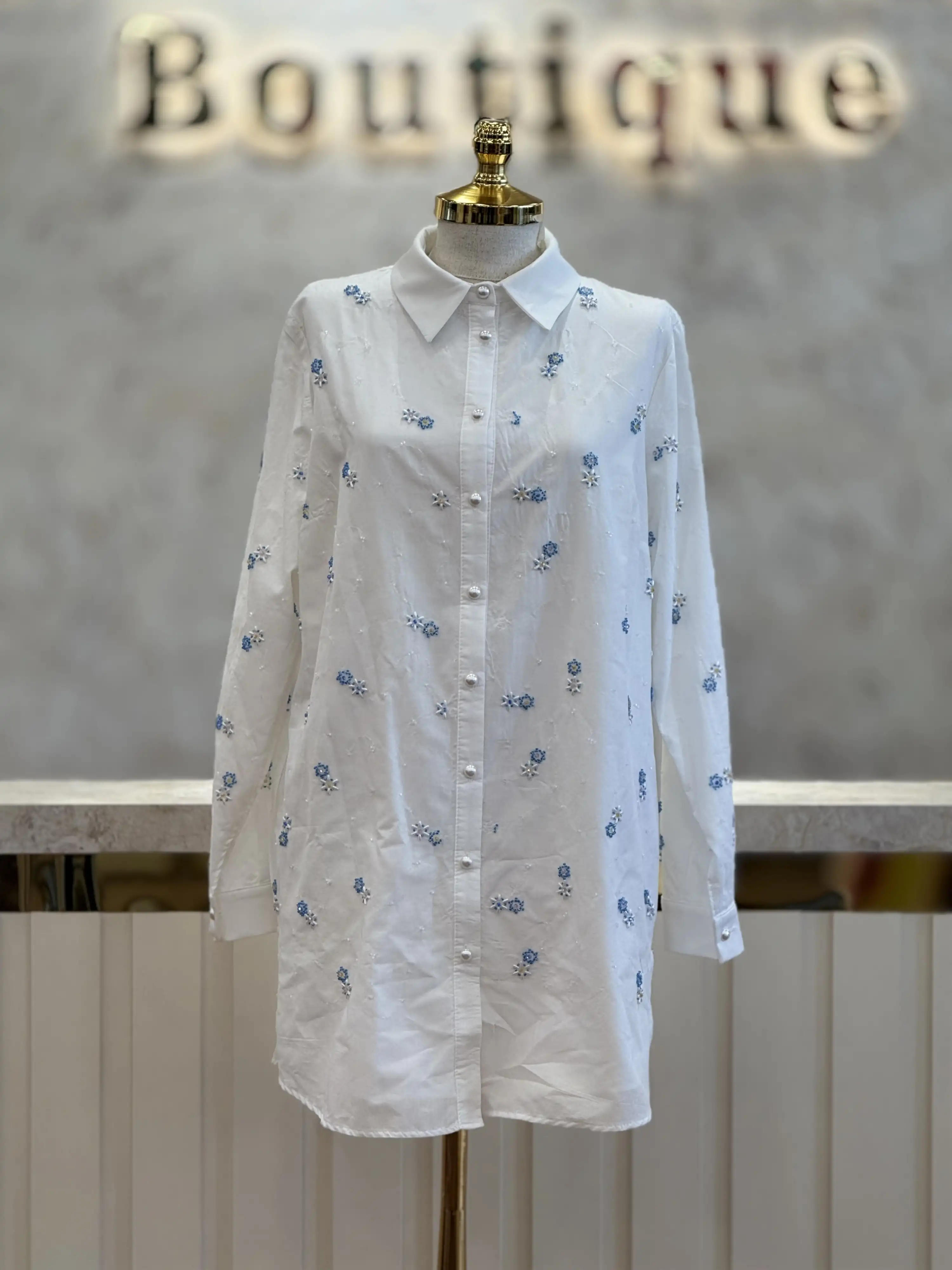 Fuat Gürşen imzalı bu özel tasarım tunik, klasik beyazın temiz görünümünü minimal mavi çiçek nakışlarıyla buluşturur. İlk bakışta sade, yaklaştıkça detaylarıyla kendini belli eden şık bir parça.