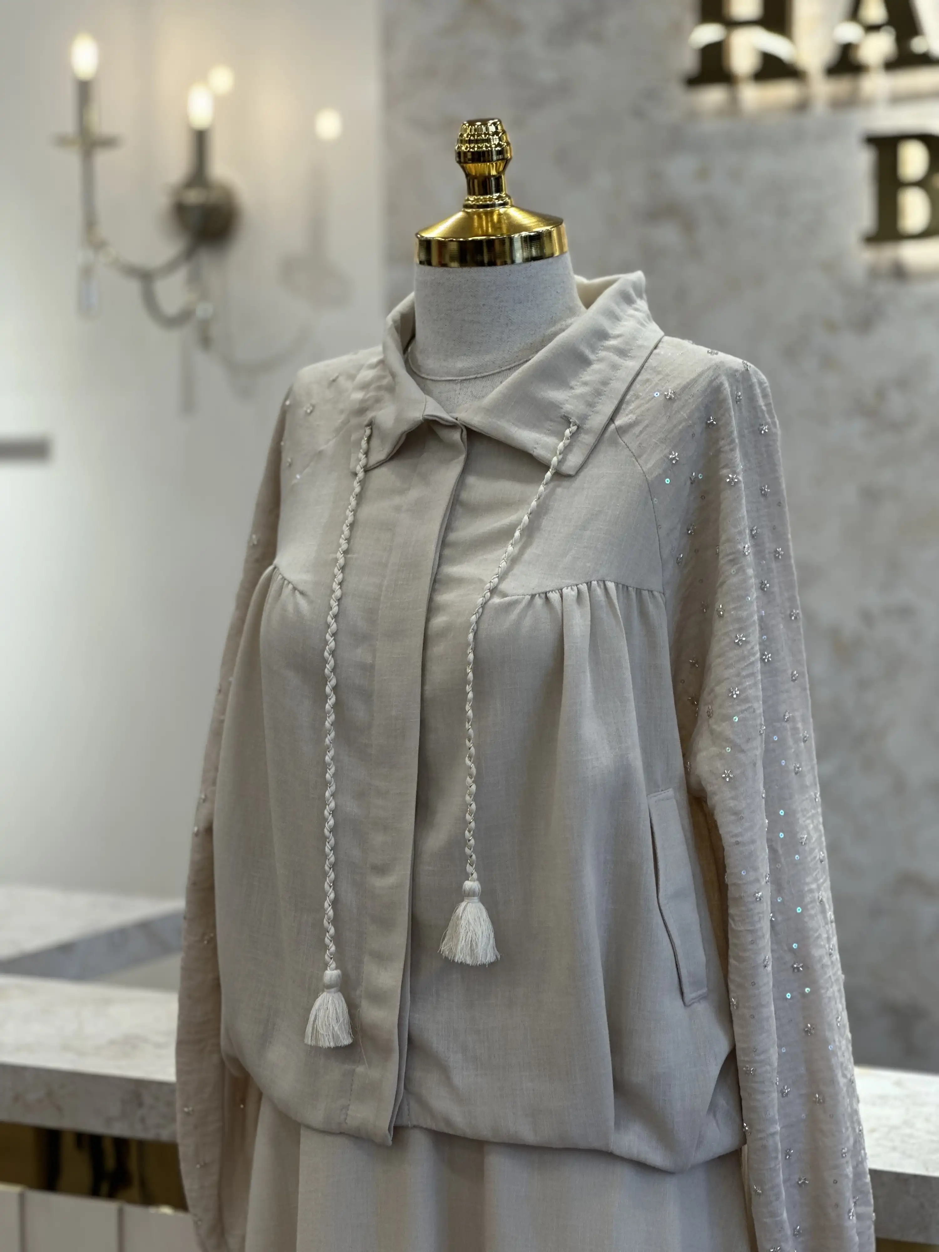 Önden çıtçıtlı kapüşonlu ferace, pileli etek, desenli şifon eşarbı ve pantolon olmak üzere dört parçadan oluşan bu takım, şıklığıyla göz kamaştırıyor.