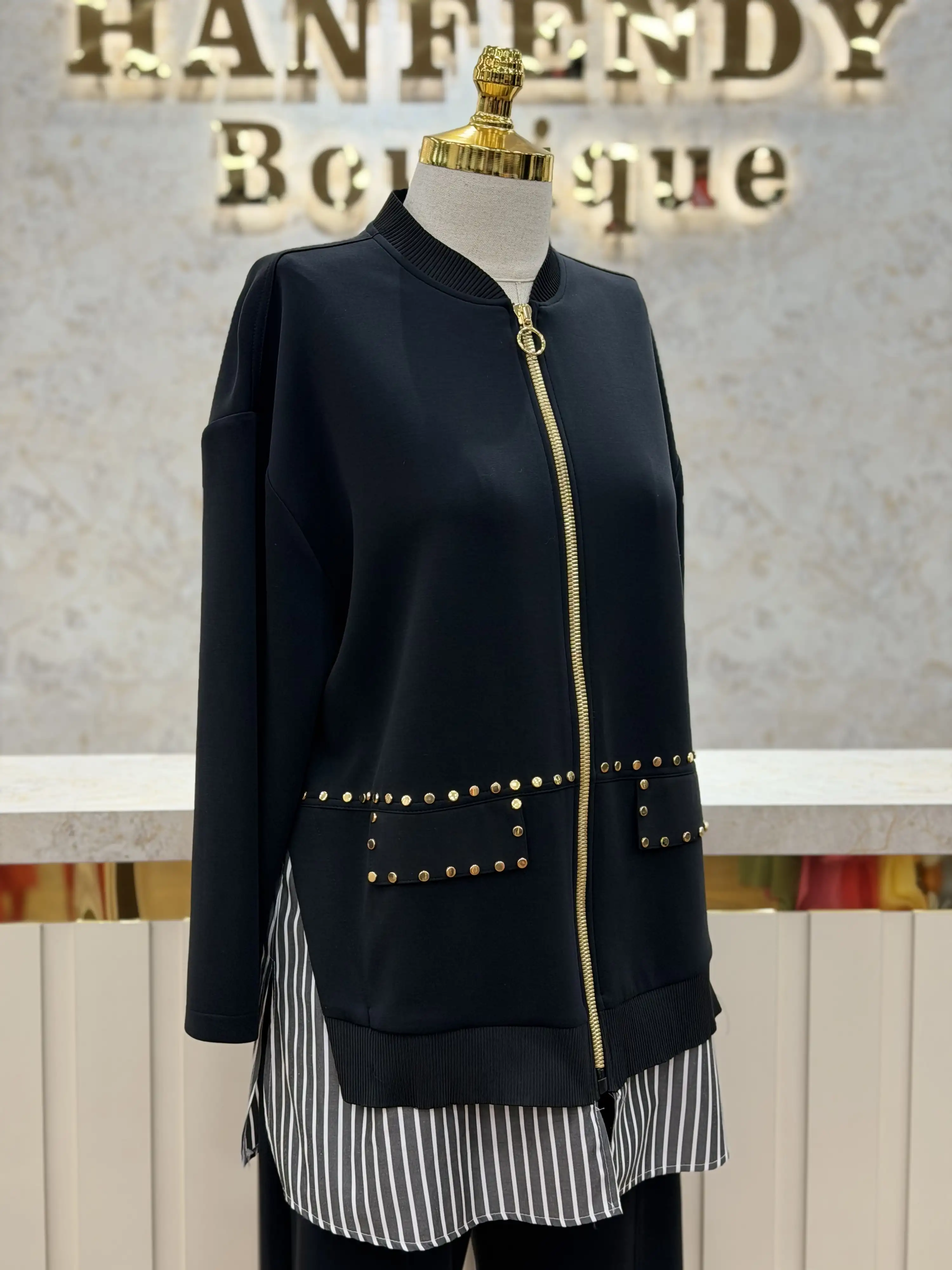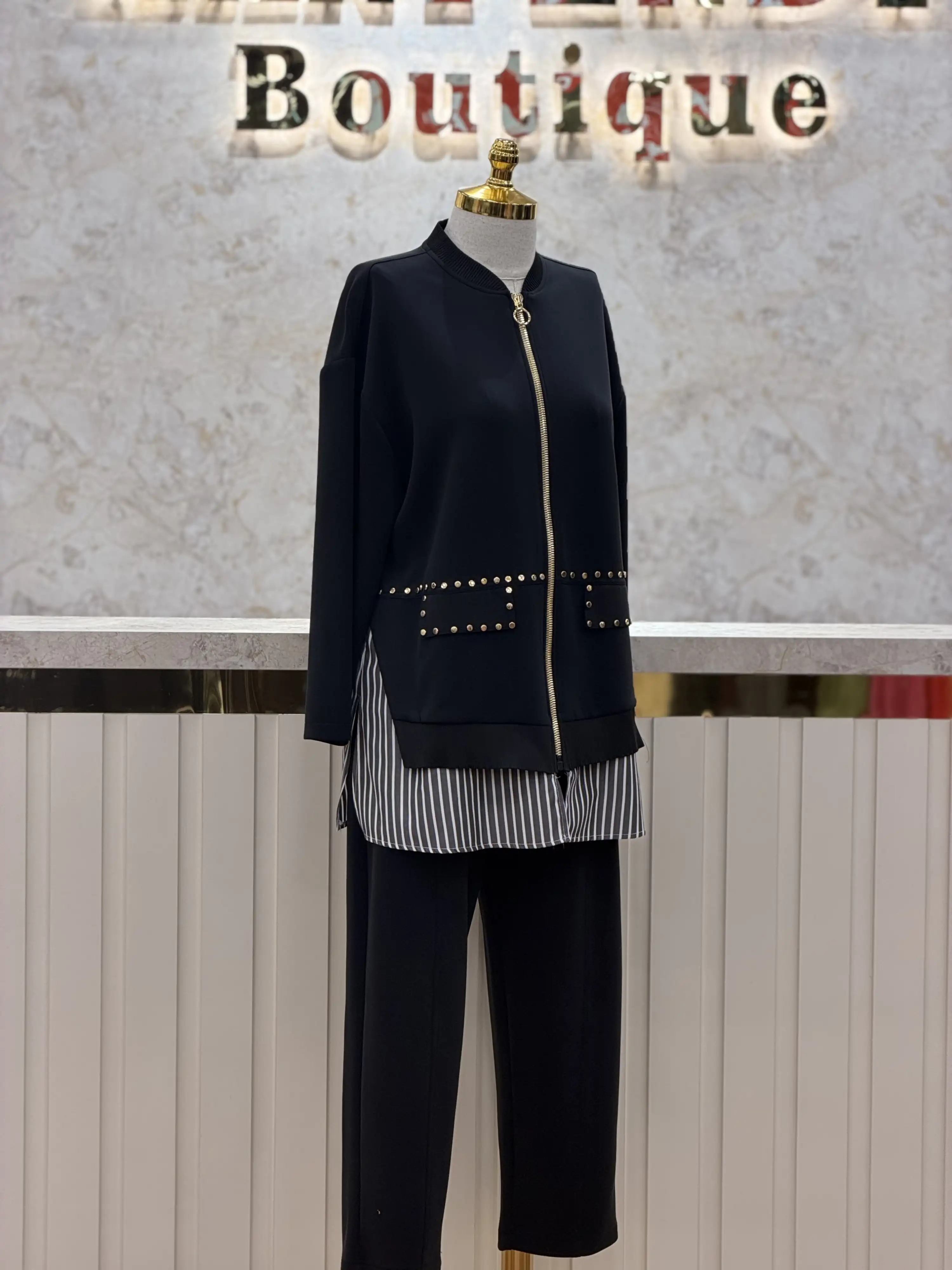 • GHİSA siyah takım, gömlek detayları ve gold fermuarı ile şıklığı ve zarafeti bir araya getiriyor. Tesettürlü giyim için ideal seçim!