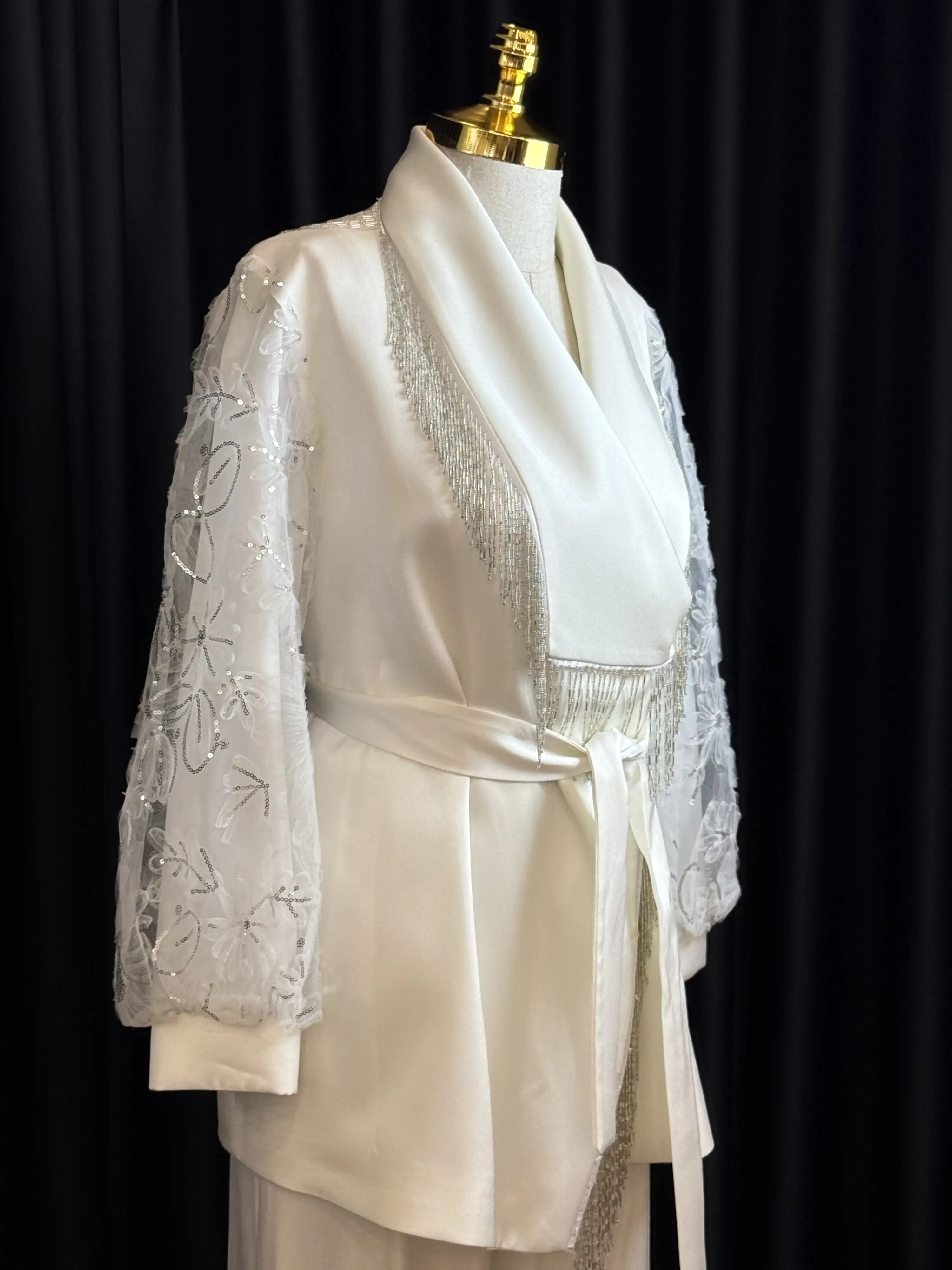 MY312 Ekru Renk Püskül Detaylı Saten Takım