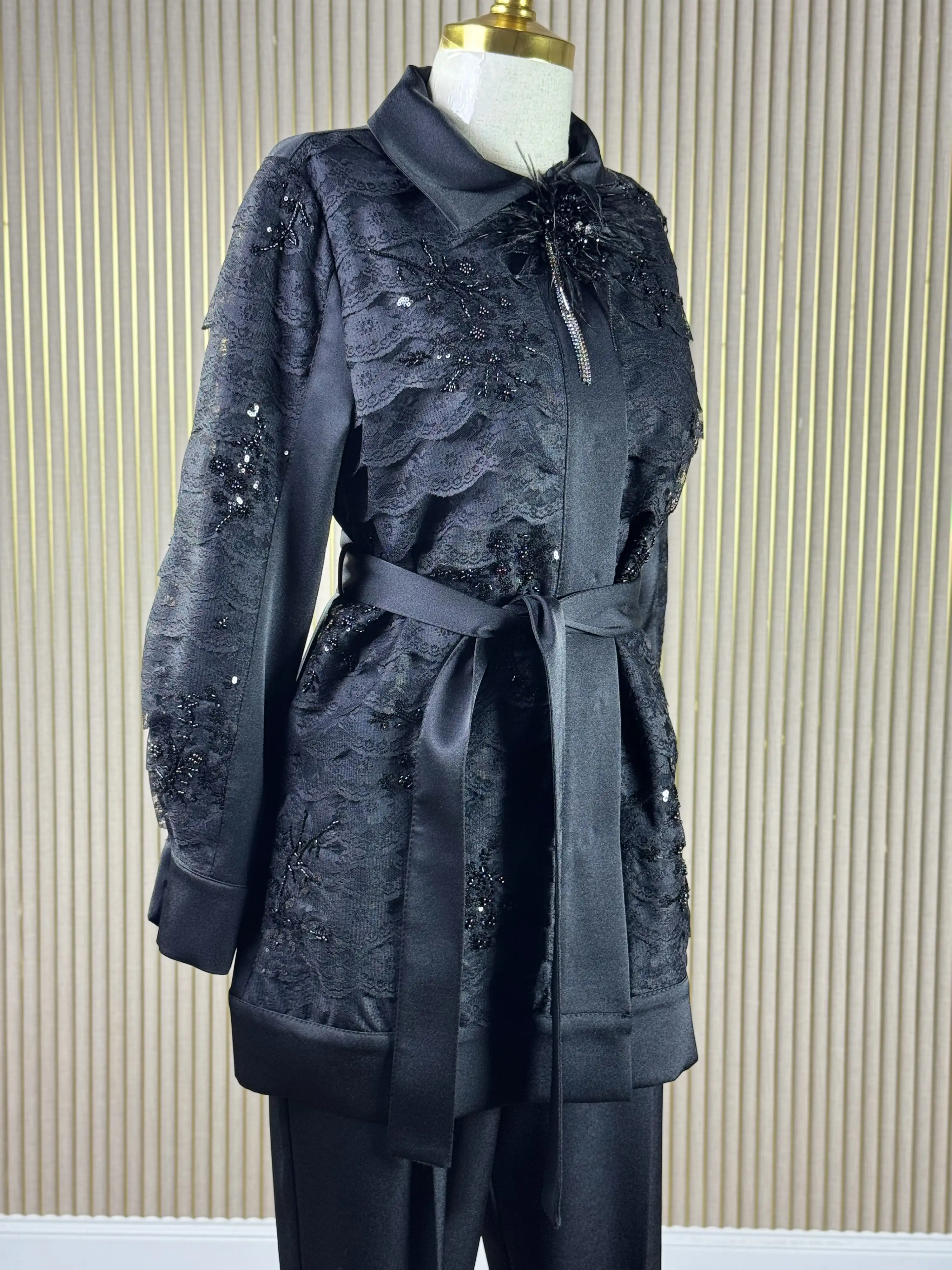 MY312 Siyah Renk Dantelli Broşlu Takım