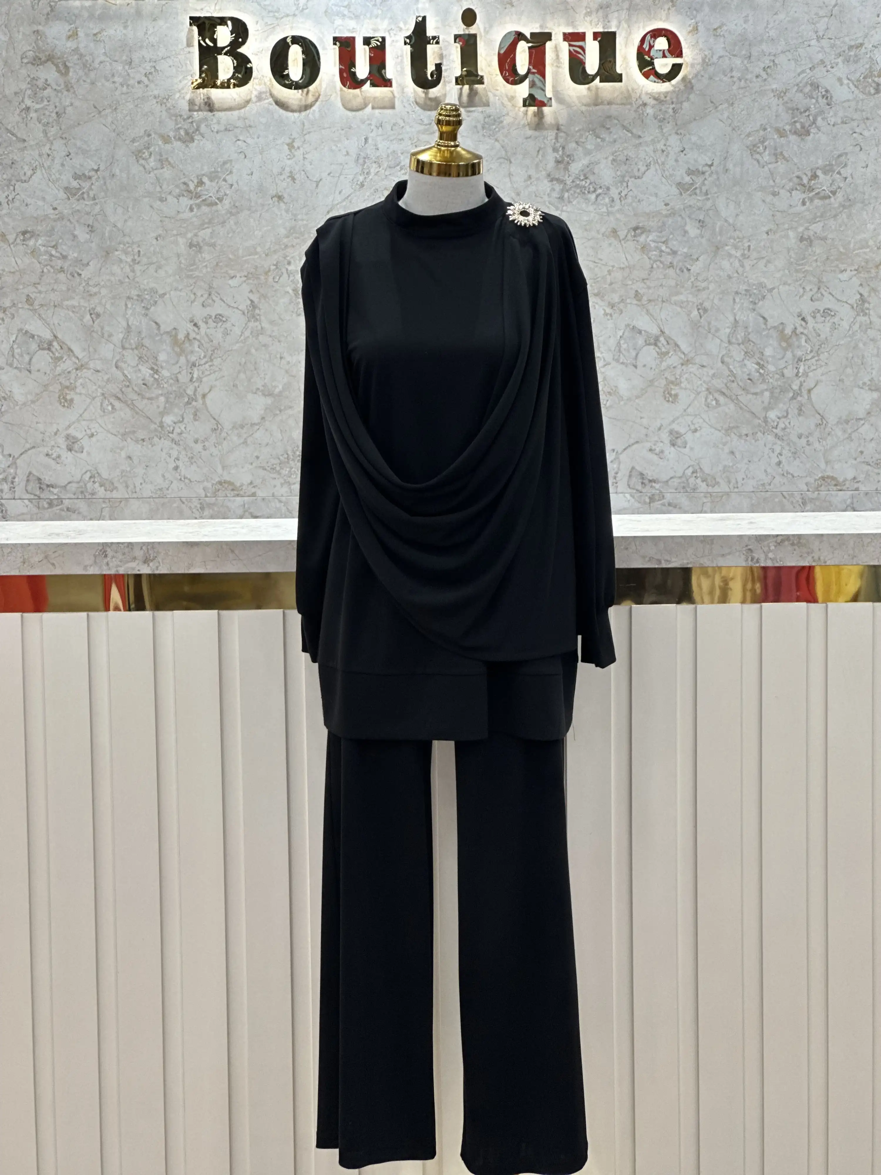 • my312 Siyah Renk Omzu Aksesuarlı Örme Takım, zarif ve şık görünüm arayan tesettürlü kadınların vazgeçilmezi.