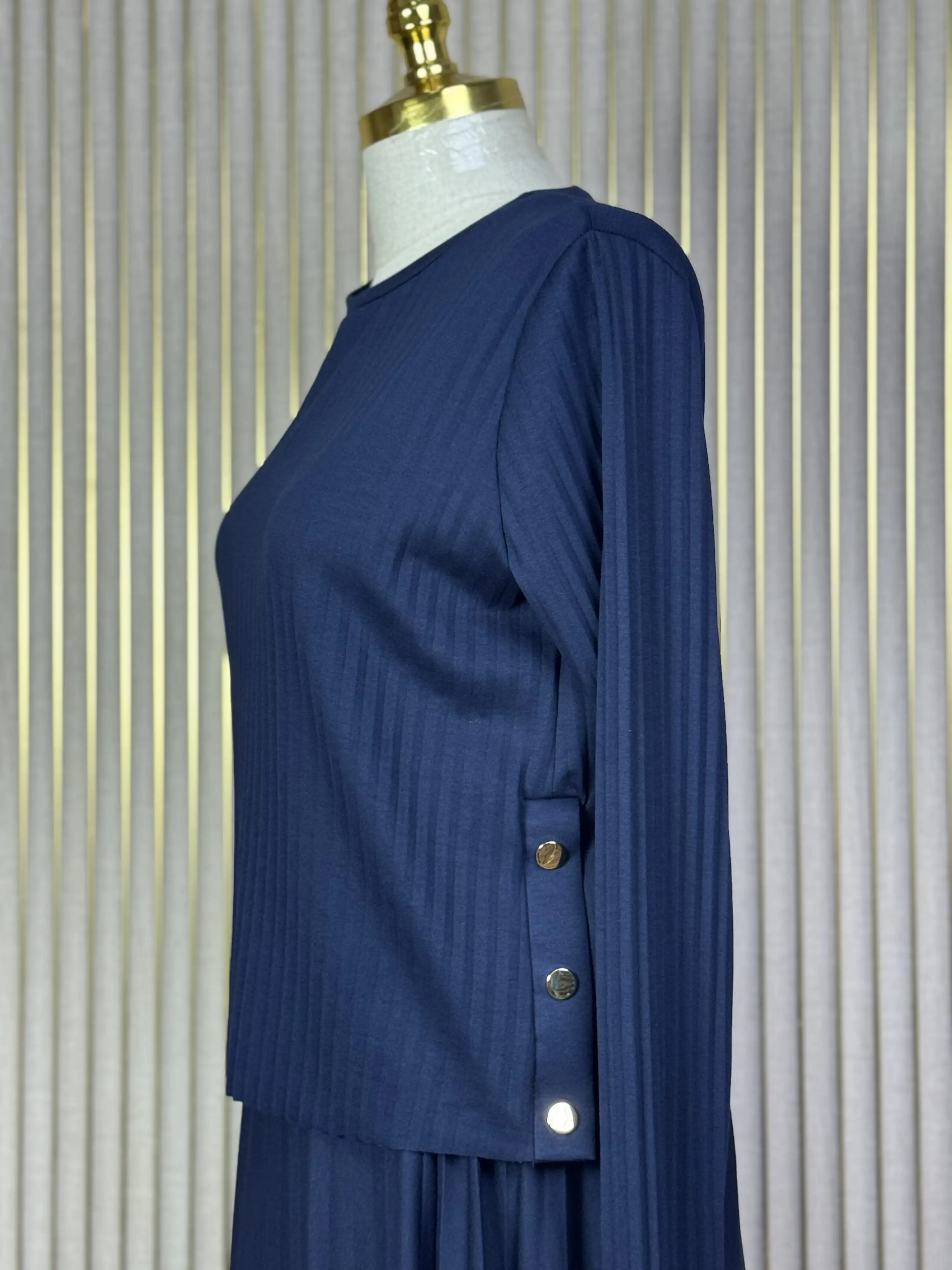 MY312 Lacivert Renk Piliseli Takım, her kadının gardırobunda olması gereken şık ve şık bir seçenektir. Yüksek kaliteli kumaşı ve özenle işlenmiş detaylarıyla tarzınızı ön plana çıkaracak bir parçadır.