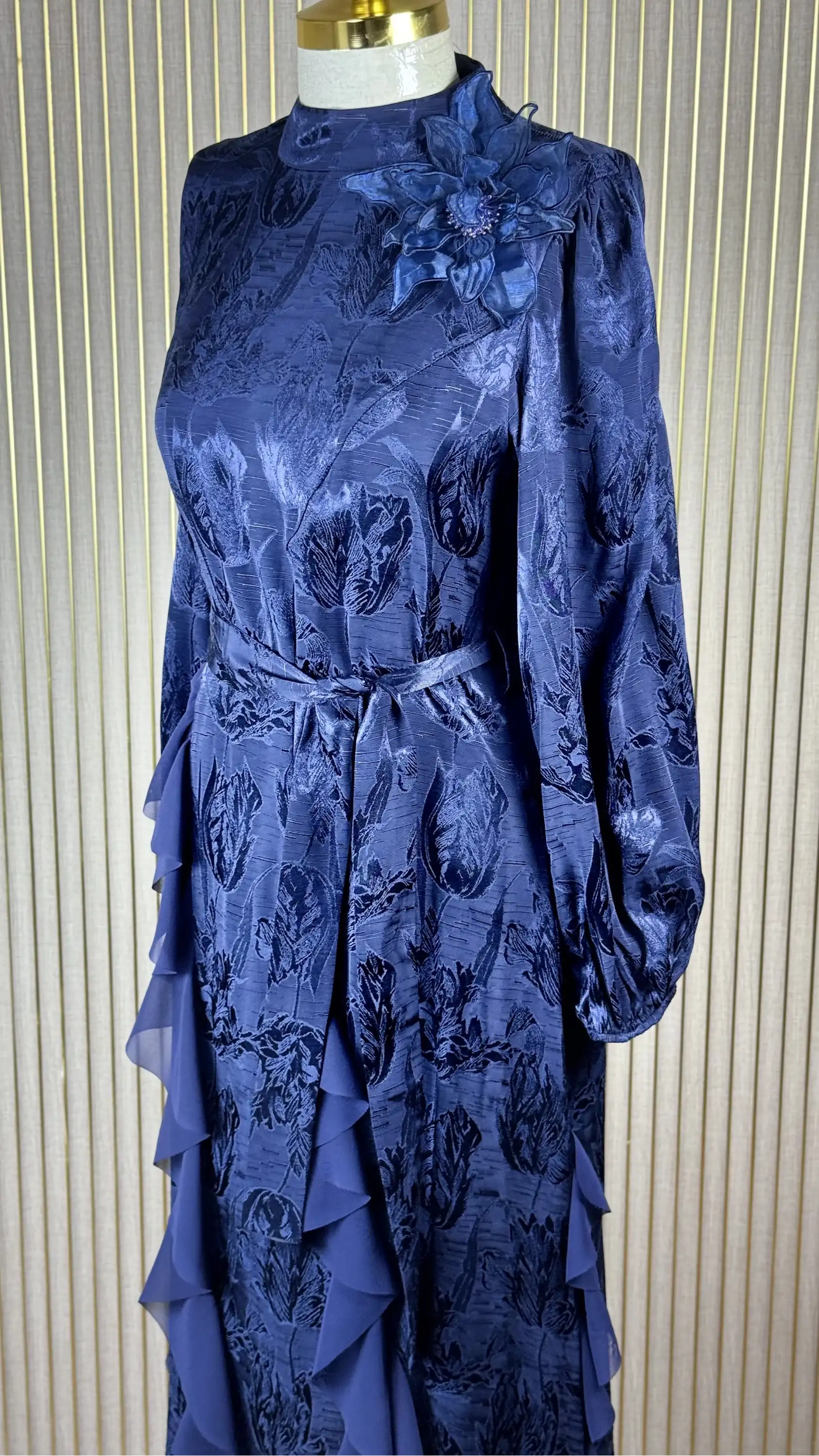 • Şıklığı ve zarafeti bir arada sunan MY312 Lacivert Renk Broş Detaylı Jakar Elbise.
