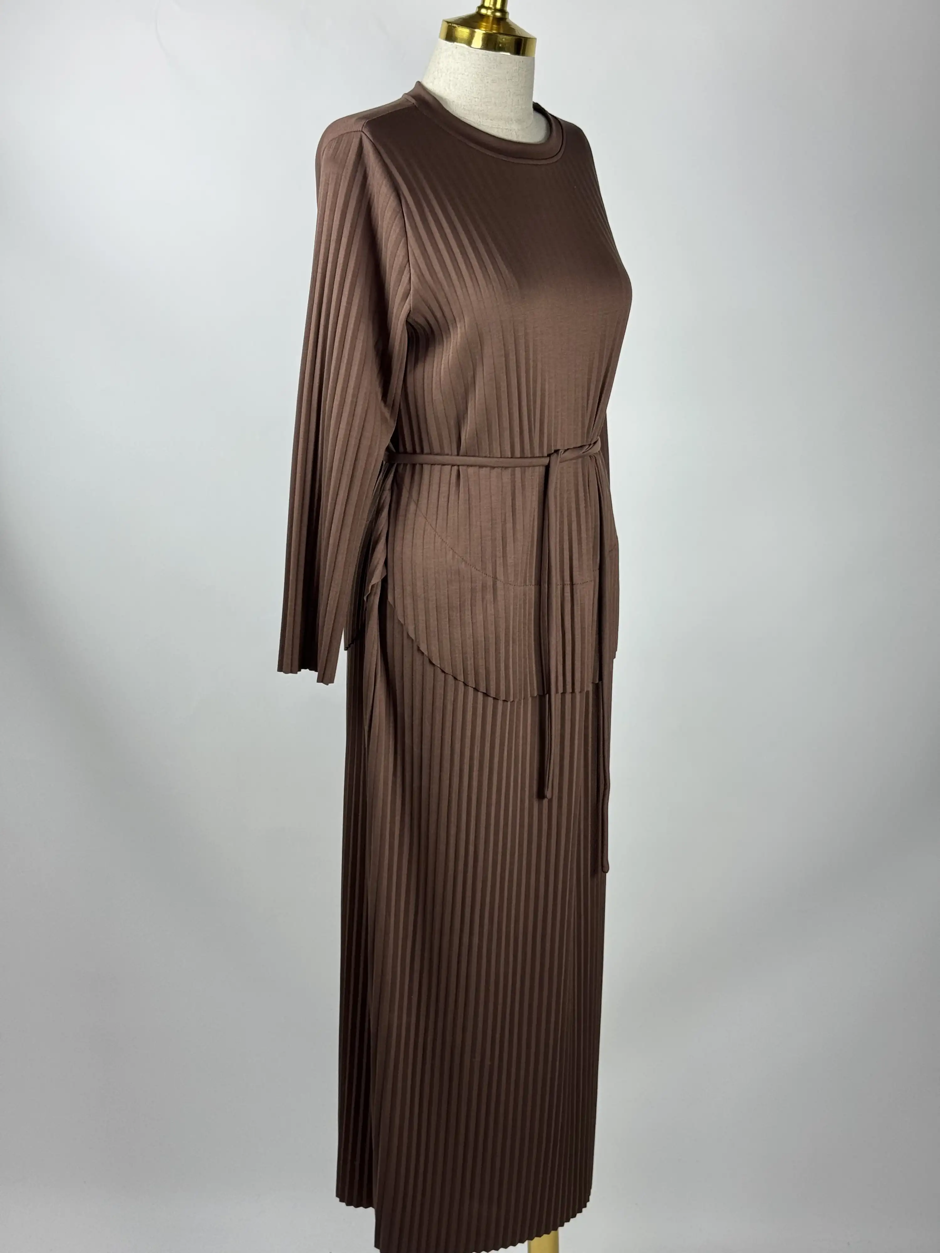 MY312 Kahve Renk Piliseli Elbise ile tarzınızı ön plana çıkarın, her ortamda şıklığınızla fark yaratın!