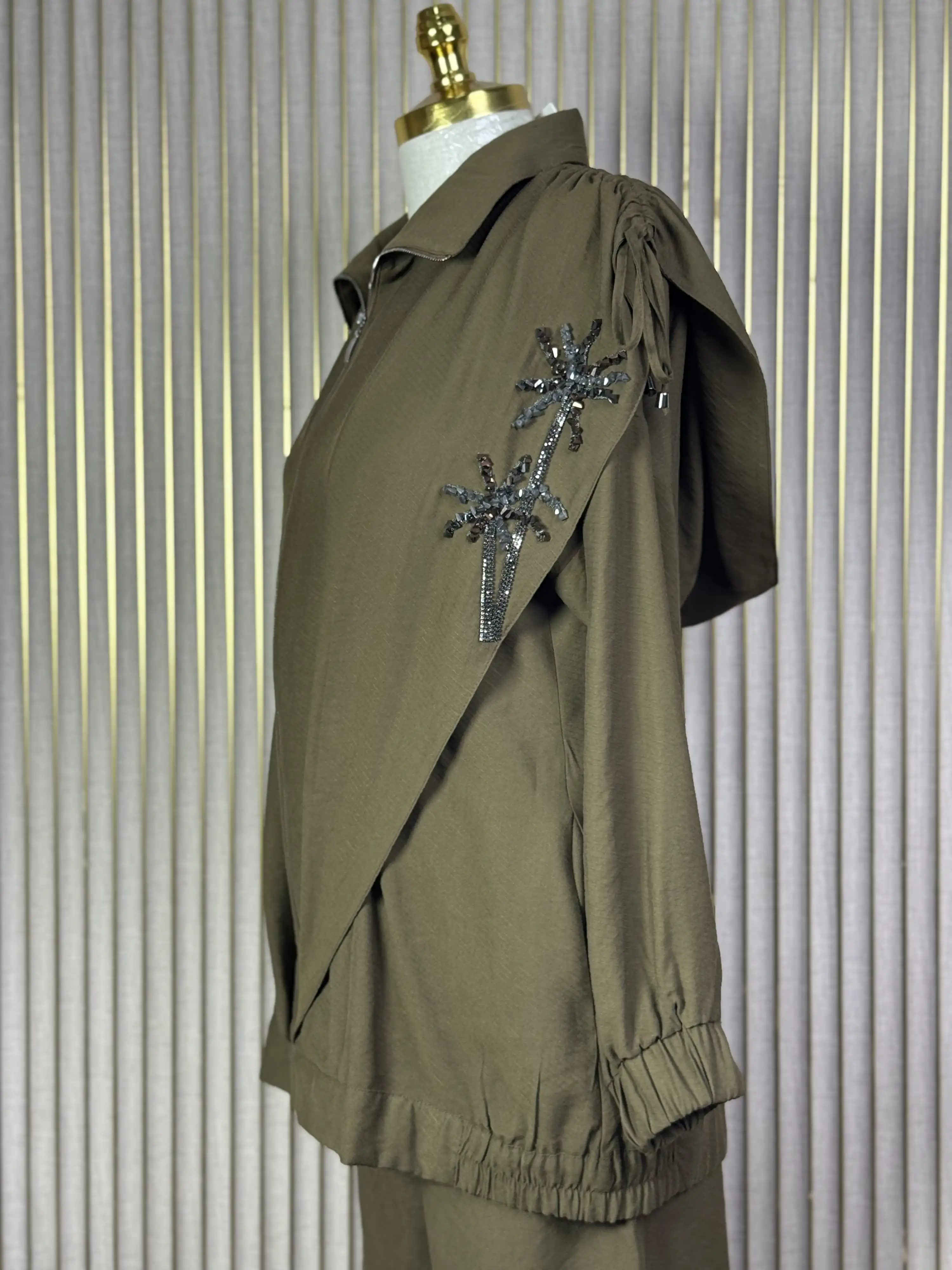 MY312 Kahve Renk Yakası Taşlı Takım, şıklığı ve zarafeti bir arada sunuyor. Bu özel takım ile her kombininize kolaylıkla uyum sağlayabilirsiniz.