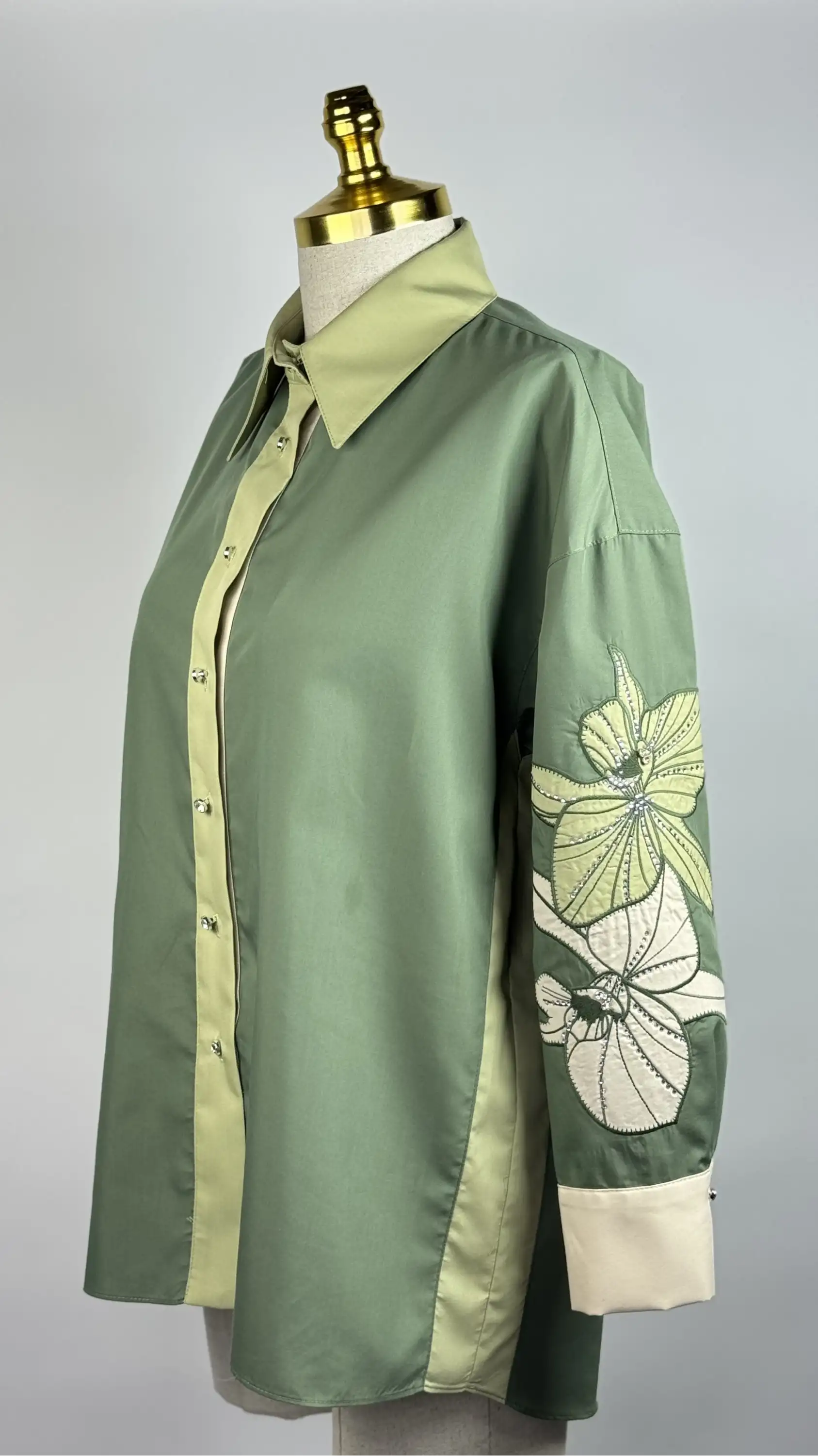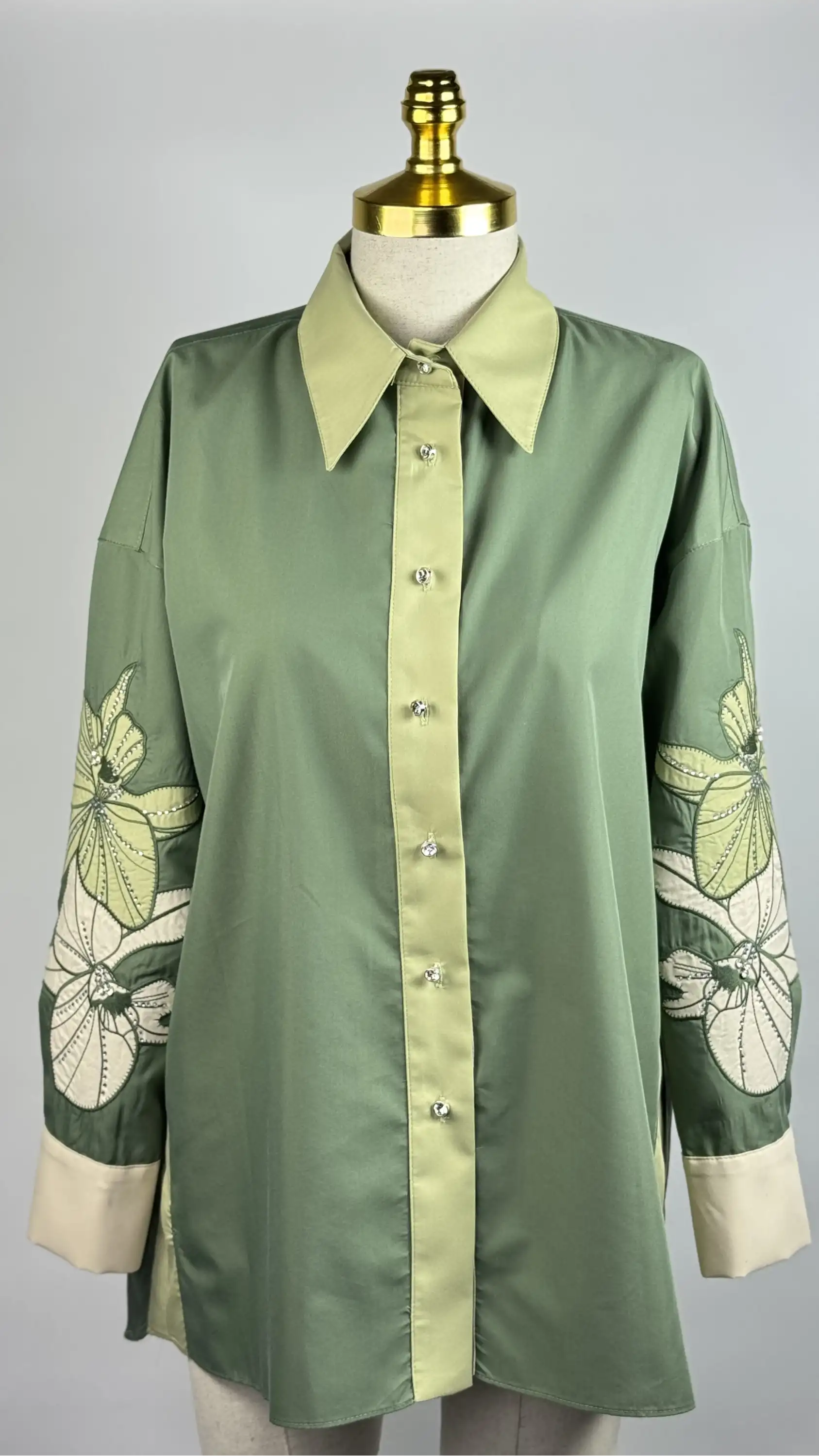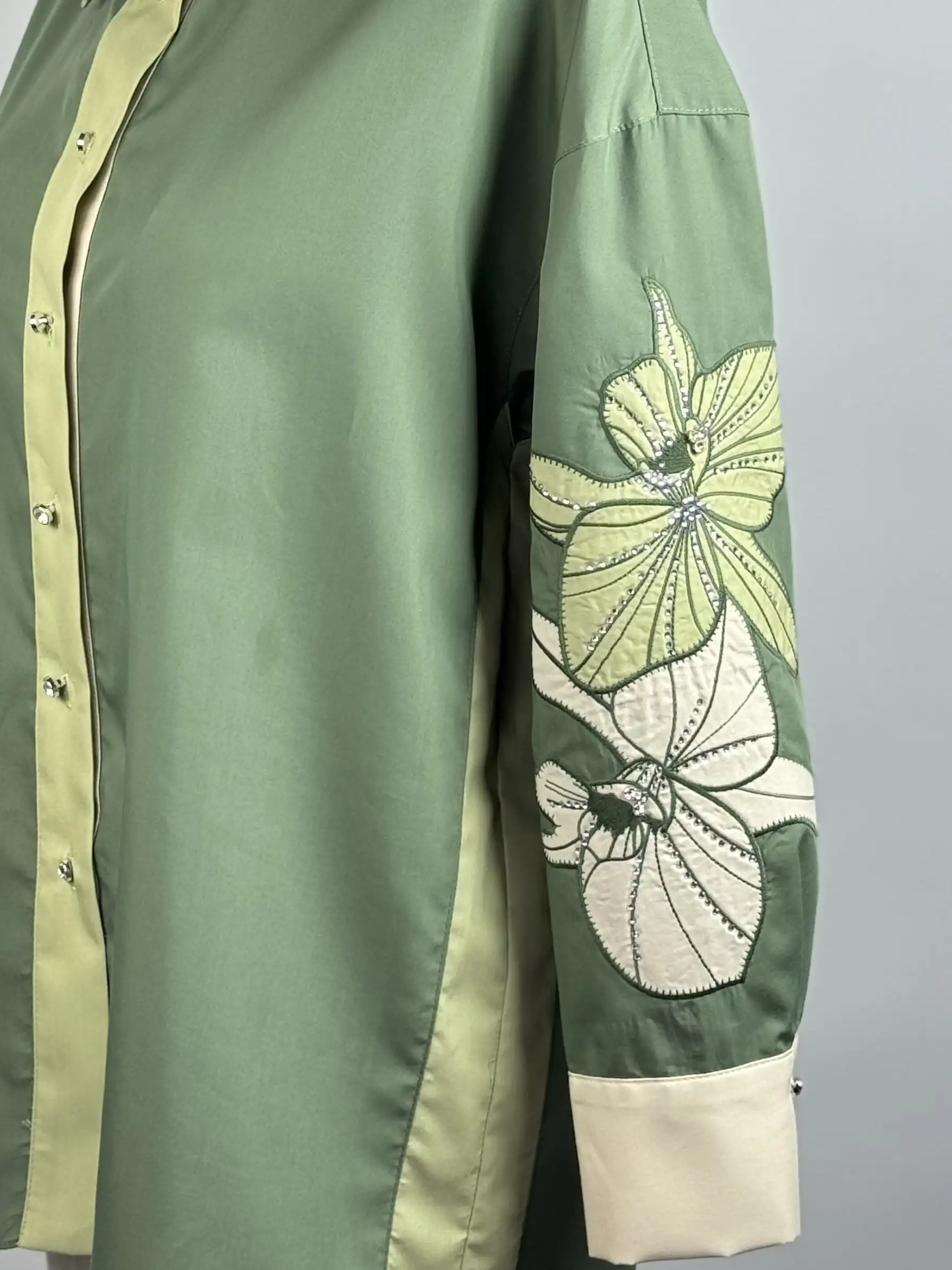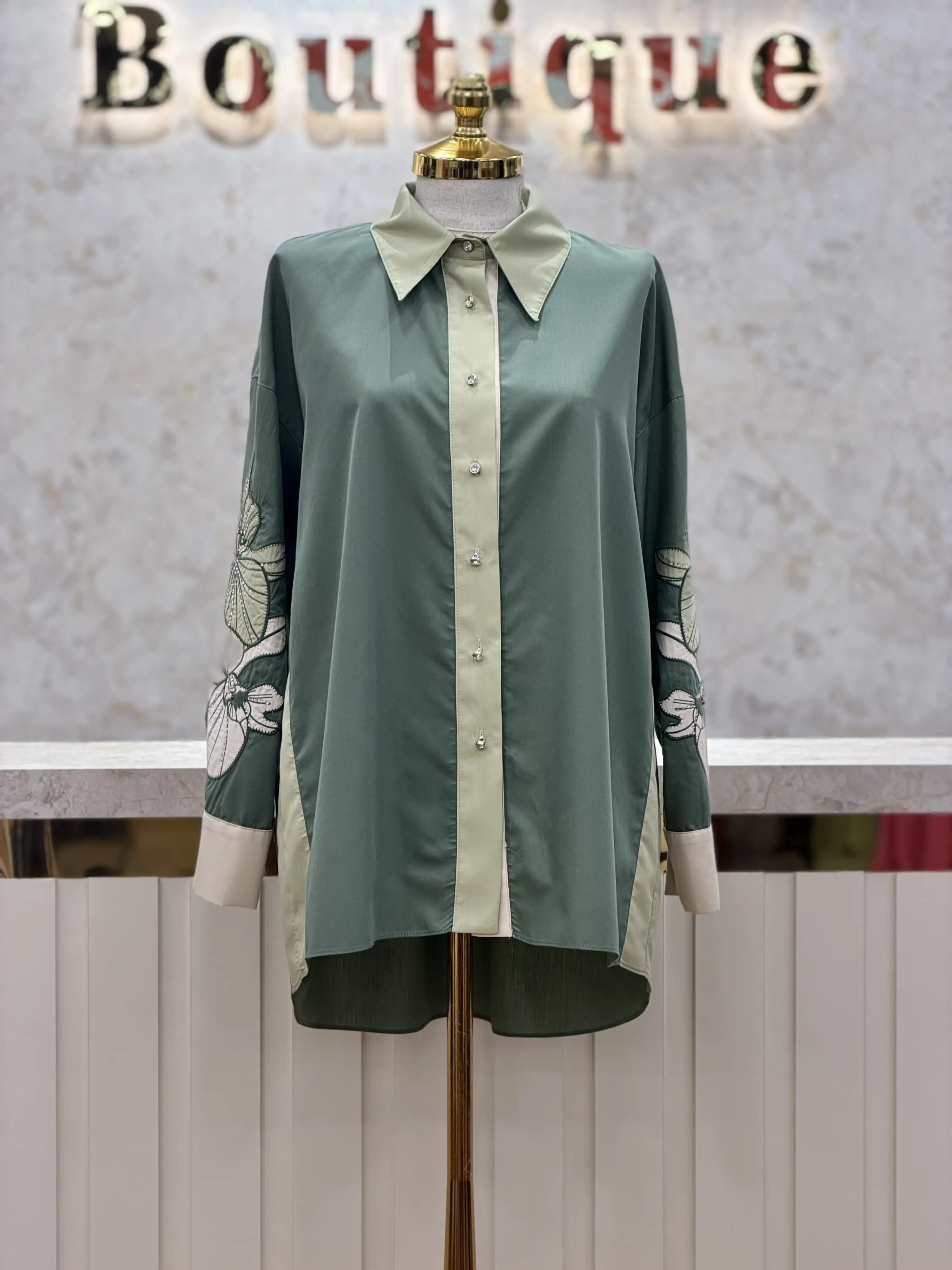 MY312 Haki Renk Kolları Nakışlı Taşlı Gömlek