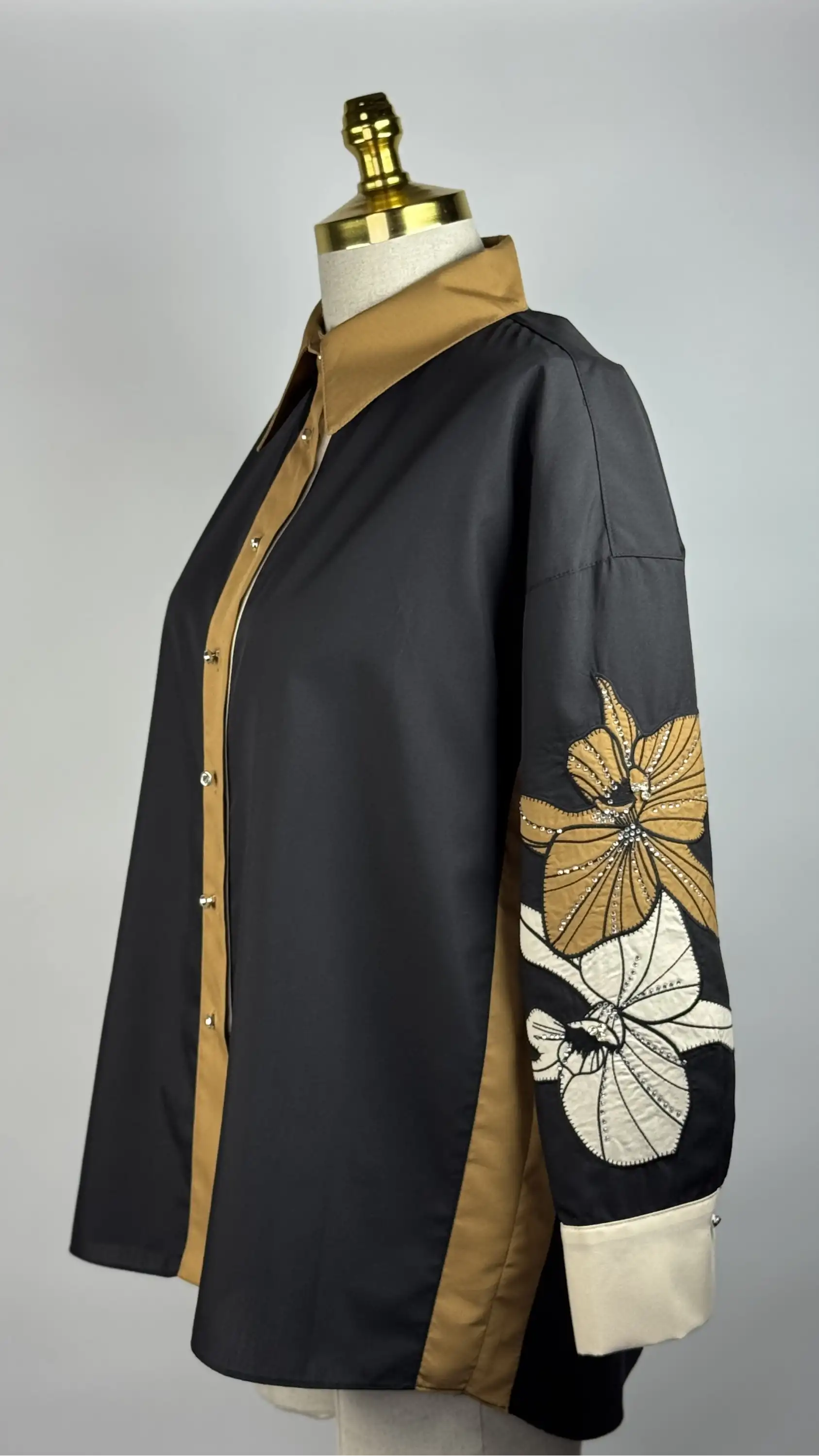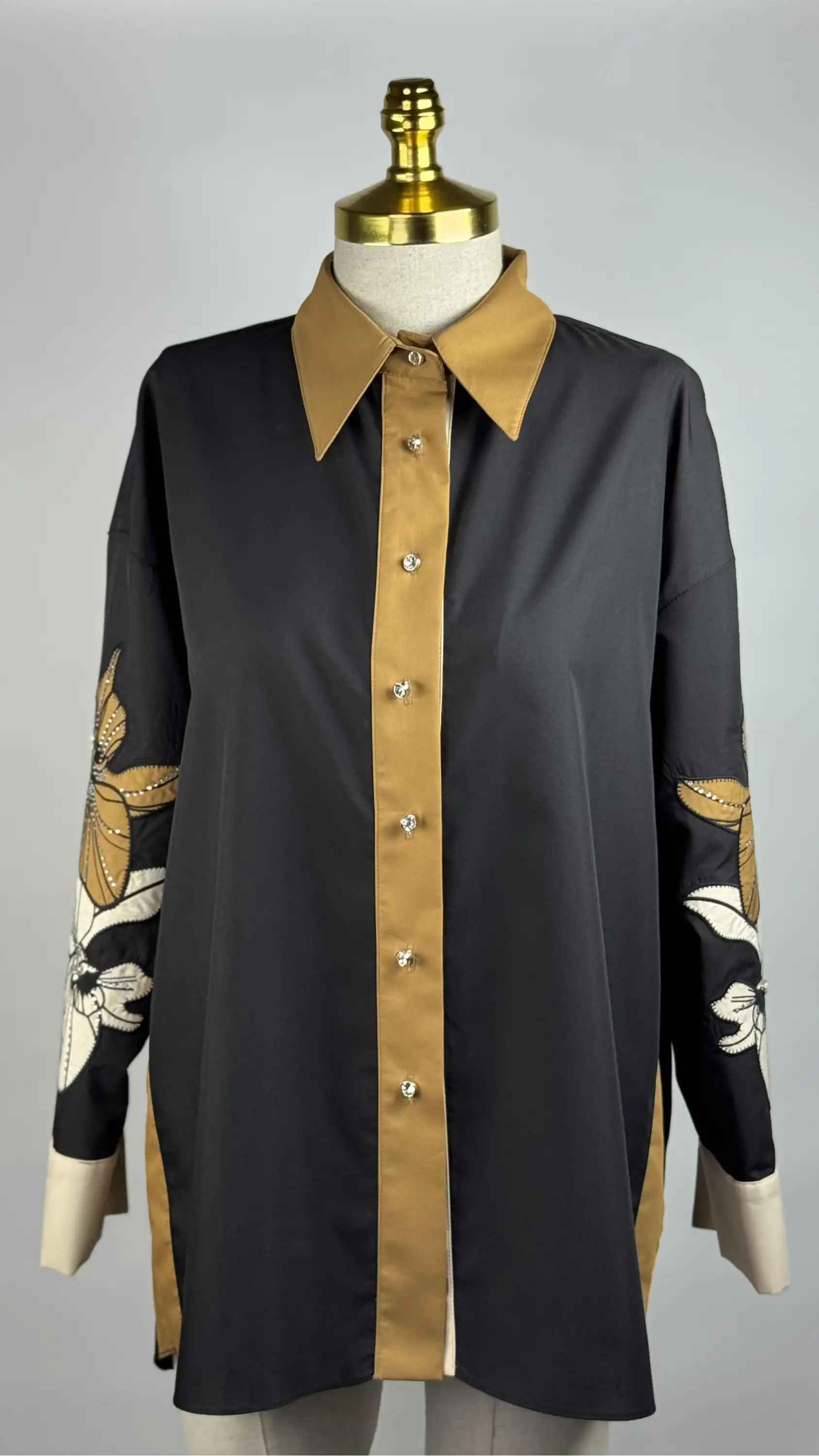 • my312 markasının siyah renkli, kolları nakışlı ve taşlı gömleği ile şıklığınızı ön plana çıkarın.