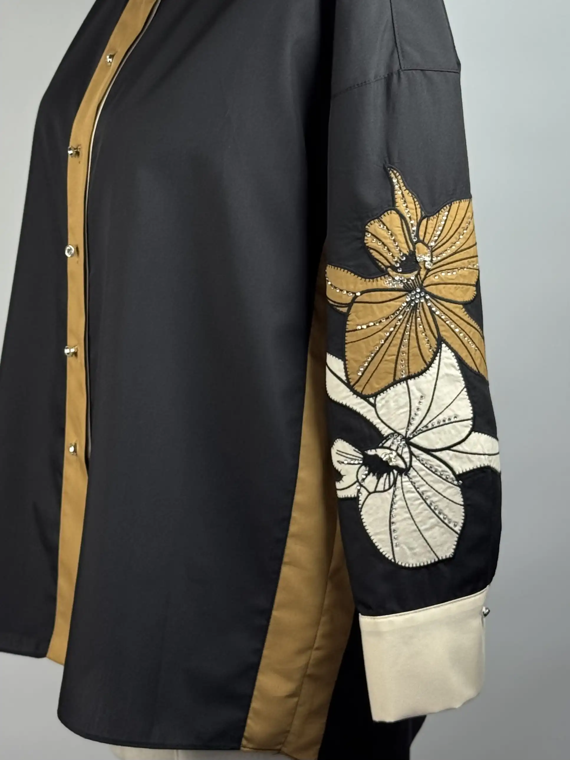MY312 markasının özel tasarımı olan MY-26S8803-S siyah renk kolları nakışlı taşlı gömlek, şıklığı ve rahatlığı bir arada sunuyor.
