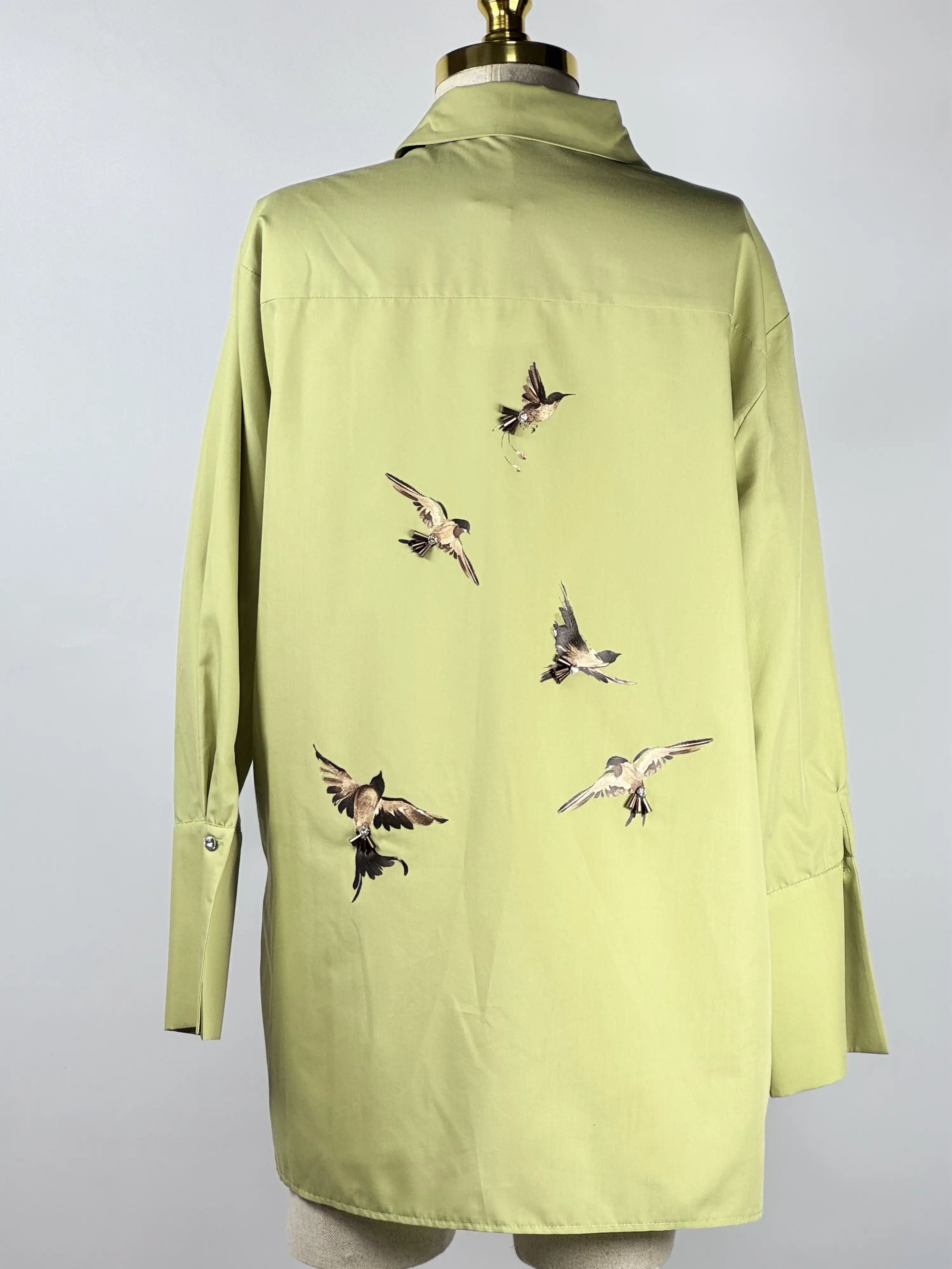 MY312 Çağla Yeşili Renk Arkası Kuş Detaylı Gömlek