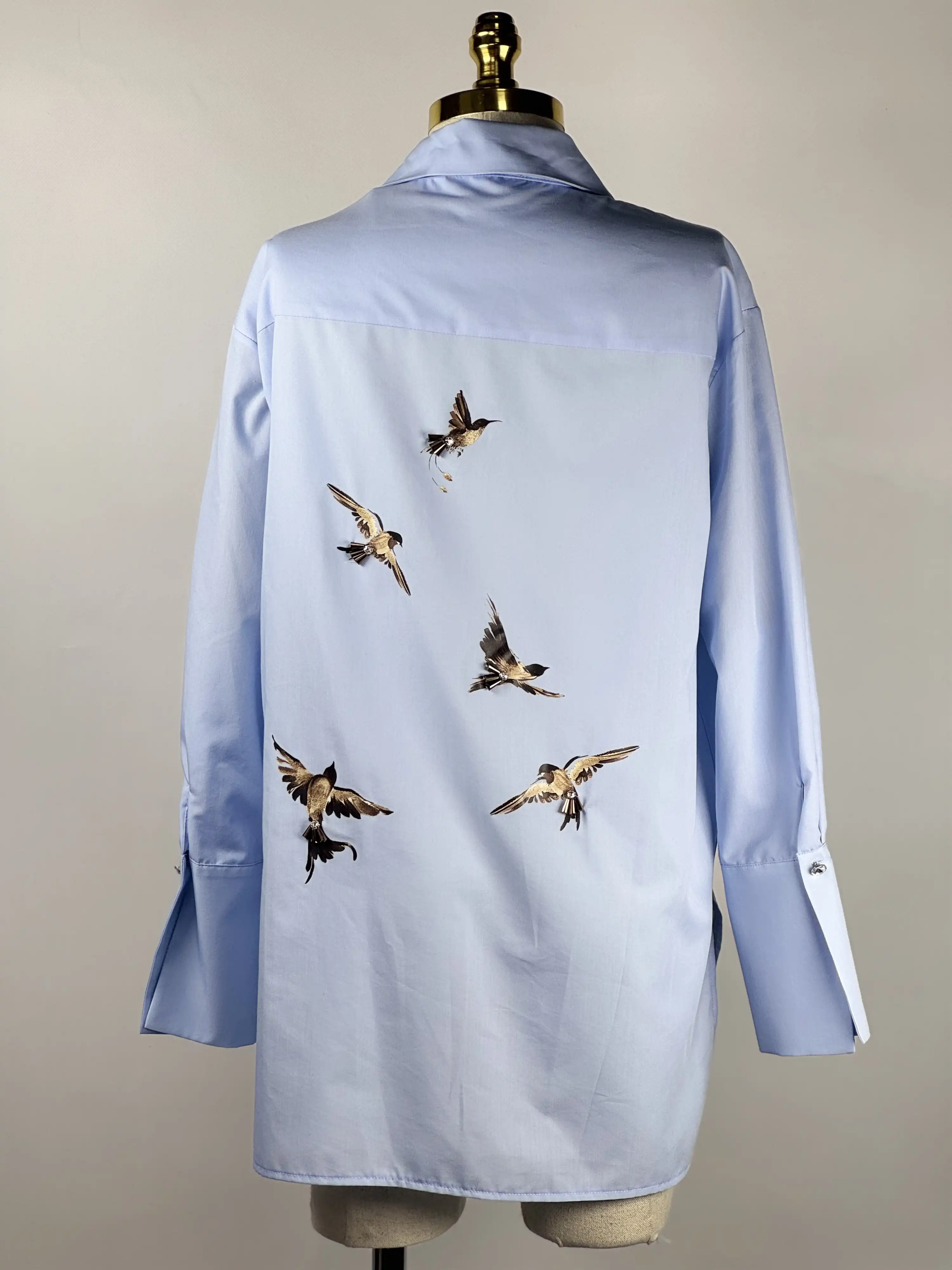 MY312 Mavi Renk Arkası Kuş Detaylı Gömlek, gardırobunuzun vazgeçilmezi olmaya aday! Siz de şimdi satın alarak hem şıklığınıza şıklık katın, hem de rahatlığı hissedin.
