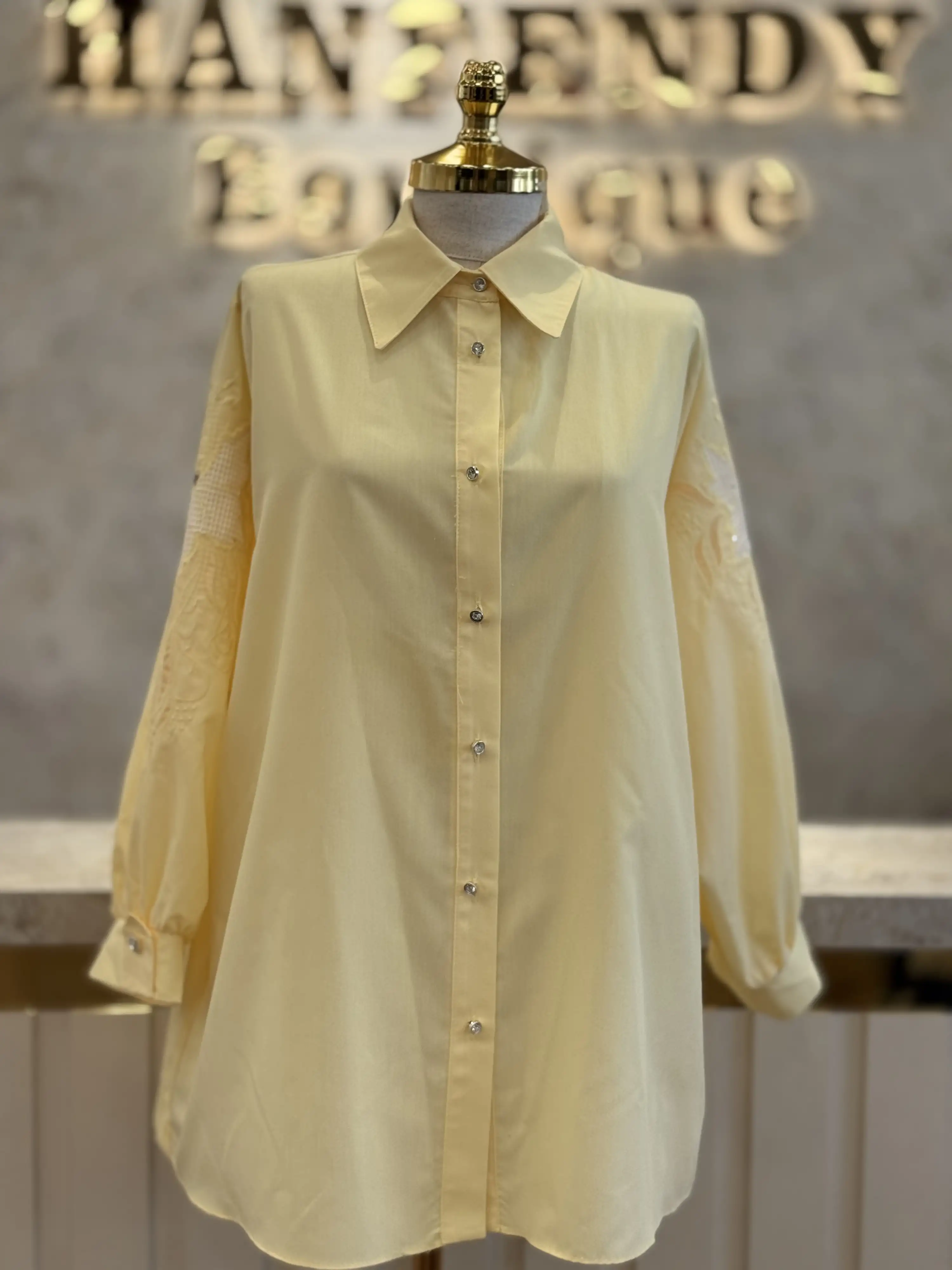 Şıklık ve zarafetin buluştuğu MY312 Sarı Renk Kolları Nakışlı Taşlı Tunik, tesettür giyimde tarzınızı yansıtmanızı sağlar.