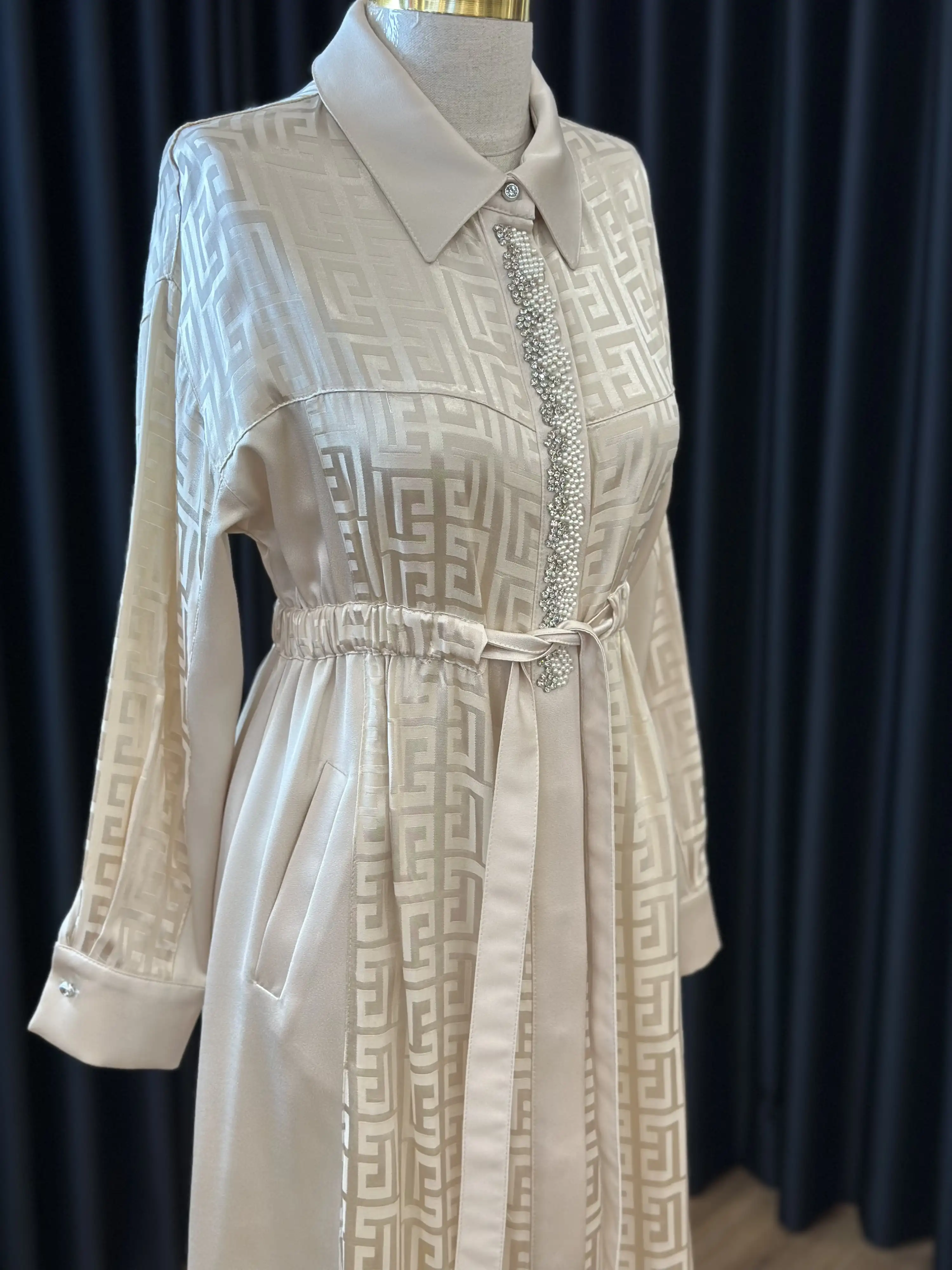 • Yılın trendi jakar desenli, taş detaylı MY312 Bej Renk Elbise sizi şıklığınızla ön plana çıkaracak!