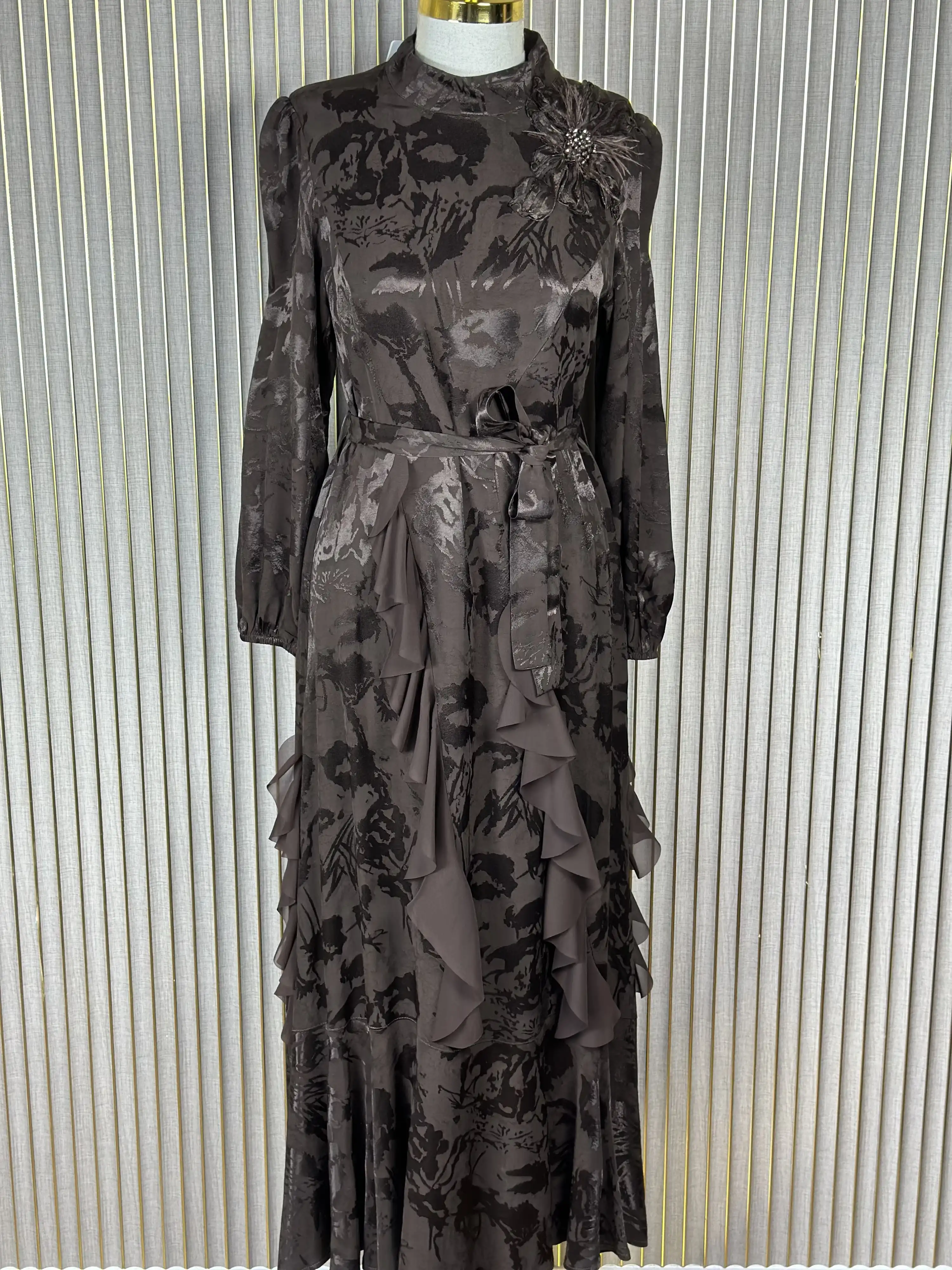 MY312 Kahve Renk Omzu İşlemeli Jakar Elbise