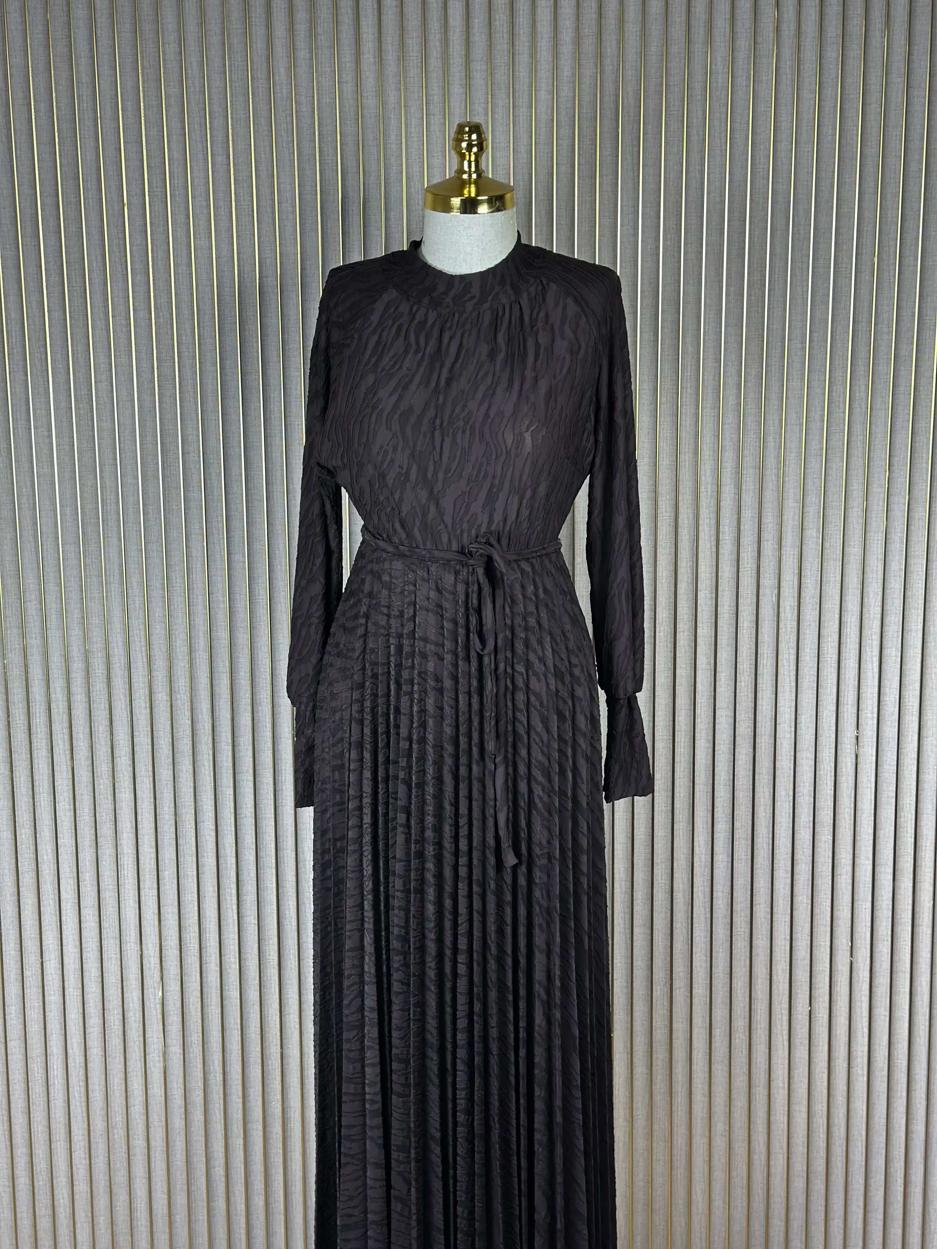 MY312 Kahve Renk Jakarlı Pilise Elbise, şıklığı ve rahatlığı bir arada sunar.
