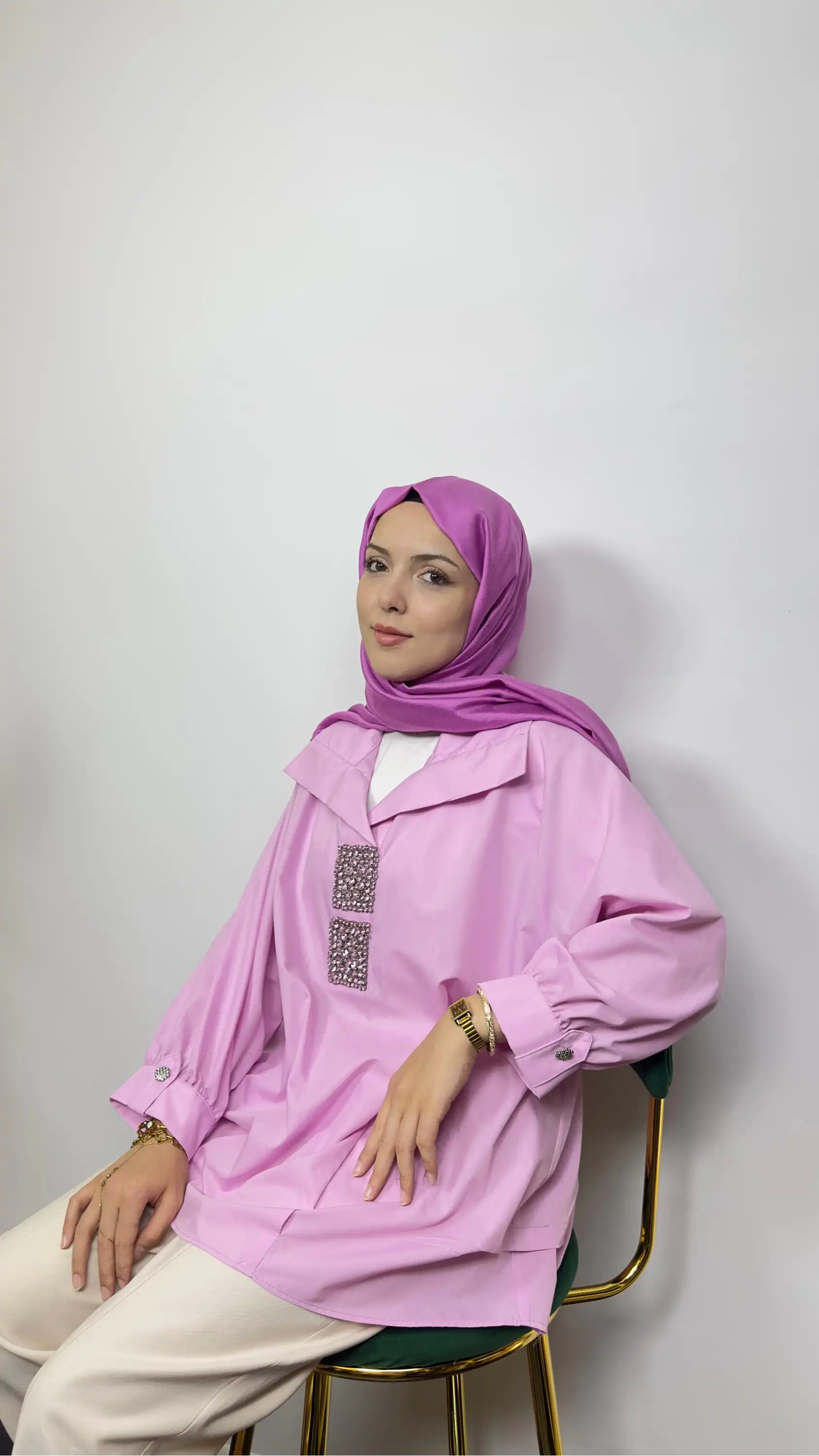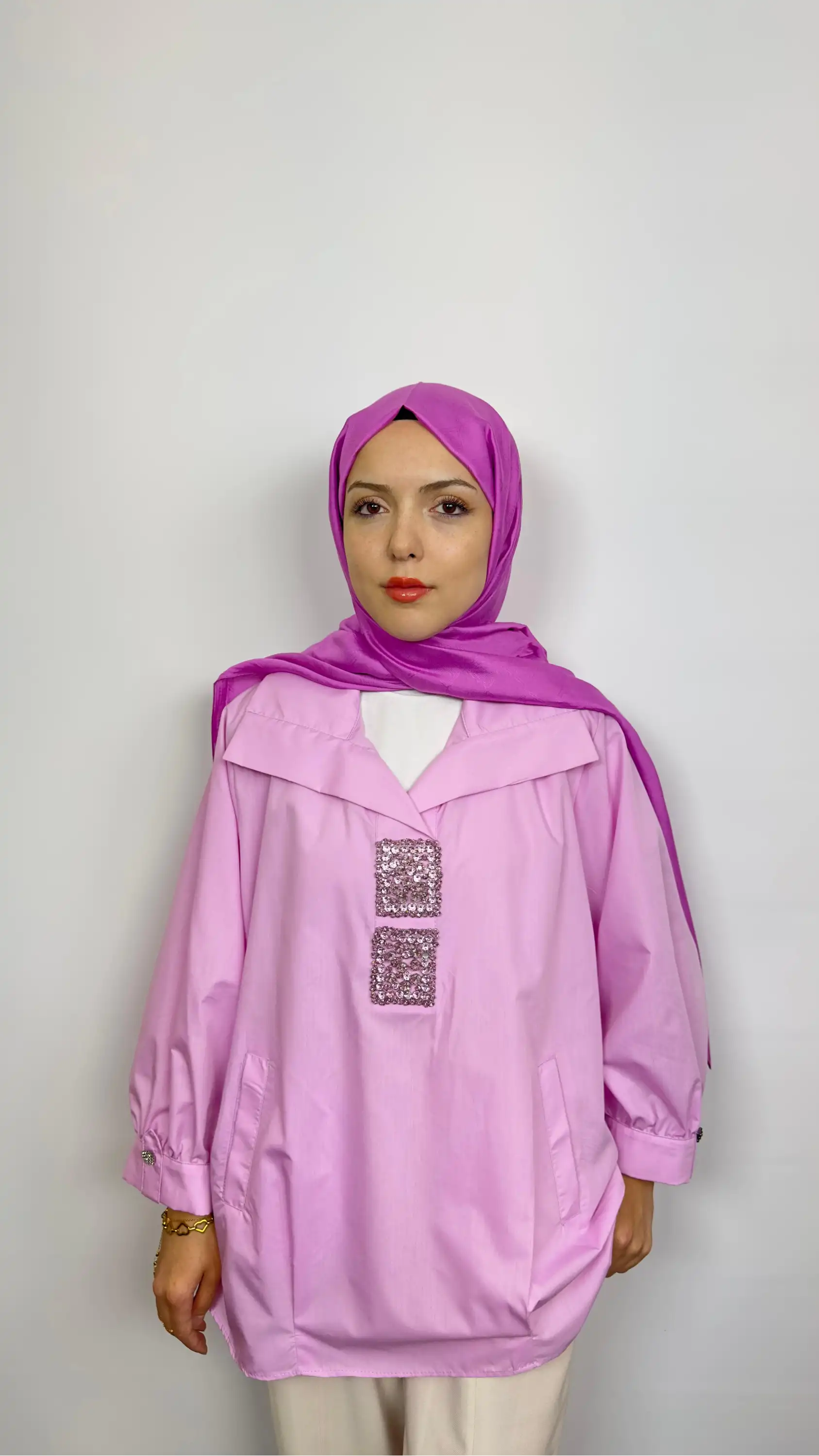MY312 markasının pudra rengiyle zarif bir hava katan önü taş detaylı gömlek modeli, modern şıklığı ve rahat kesimiyle dolabınızın favorisi olacak.