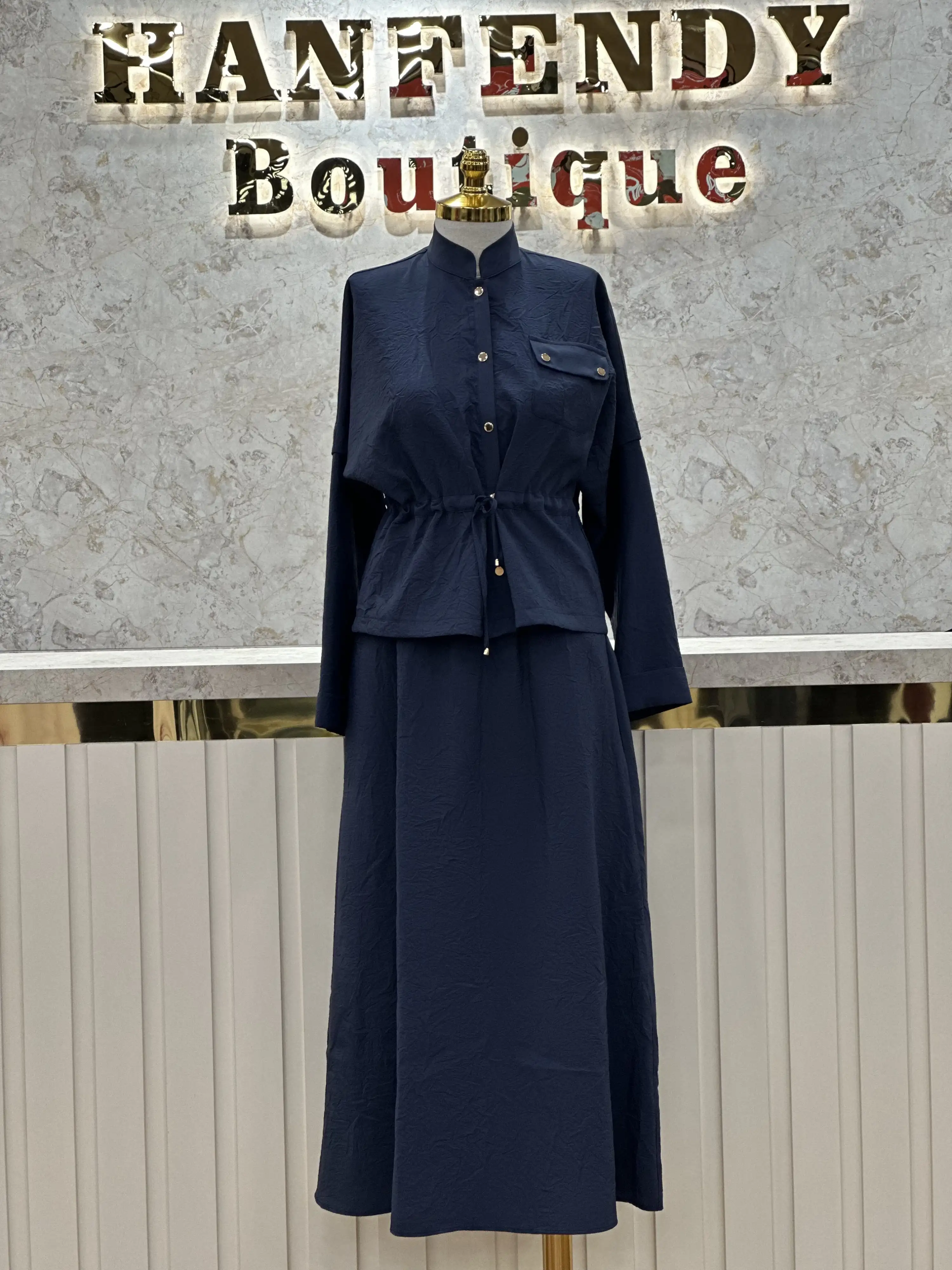Tesettür giyim arayışında olanlar için vazgeçilmez bir parça olan NUSS Lacivert Renk Etekli Takım, tasarımı ve konforu ile beklentilerinizi karşılayacak.