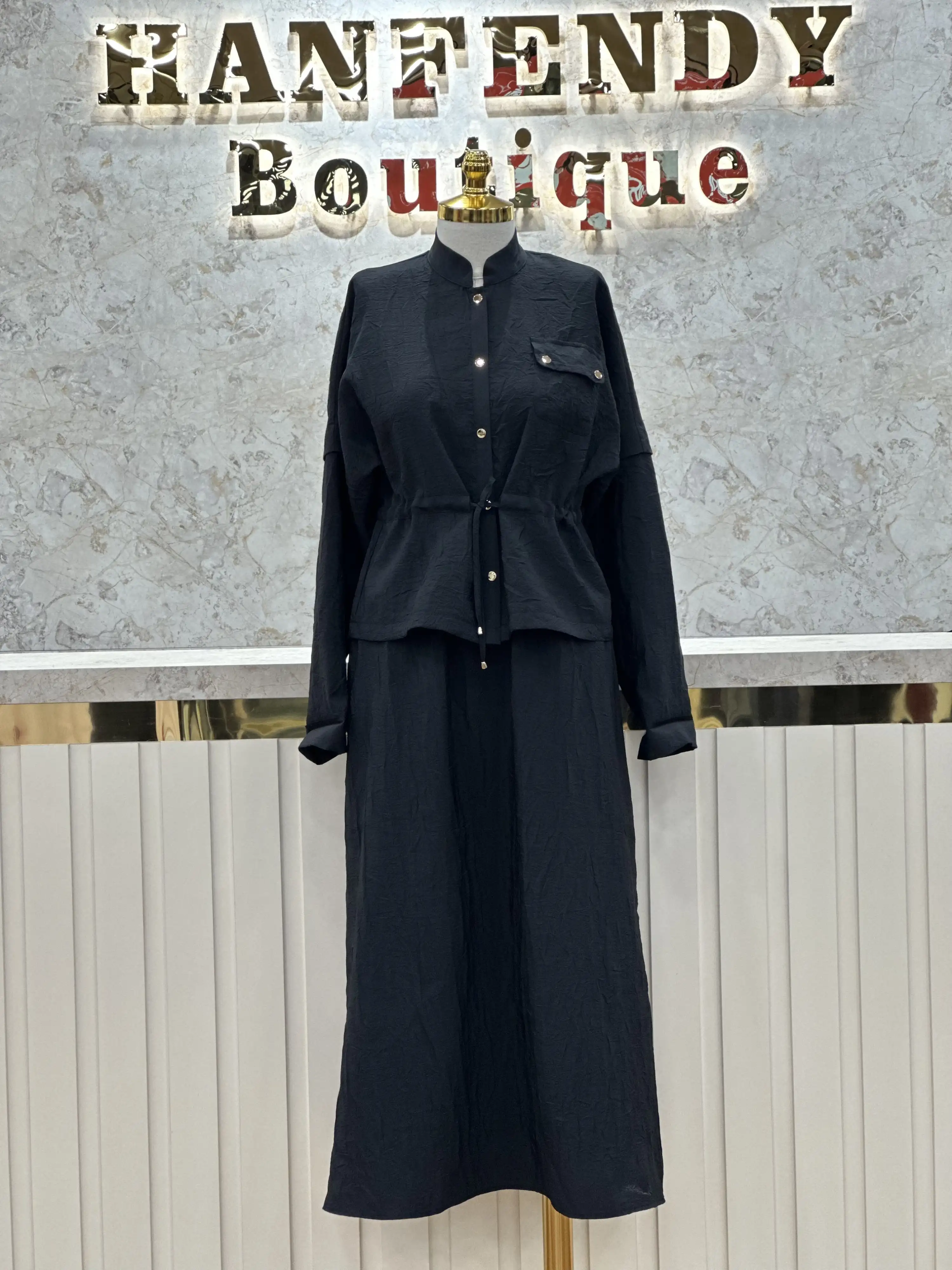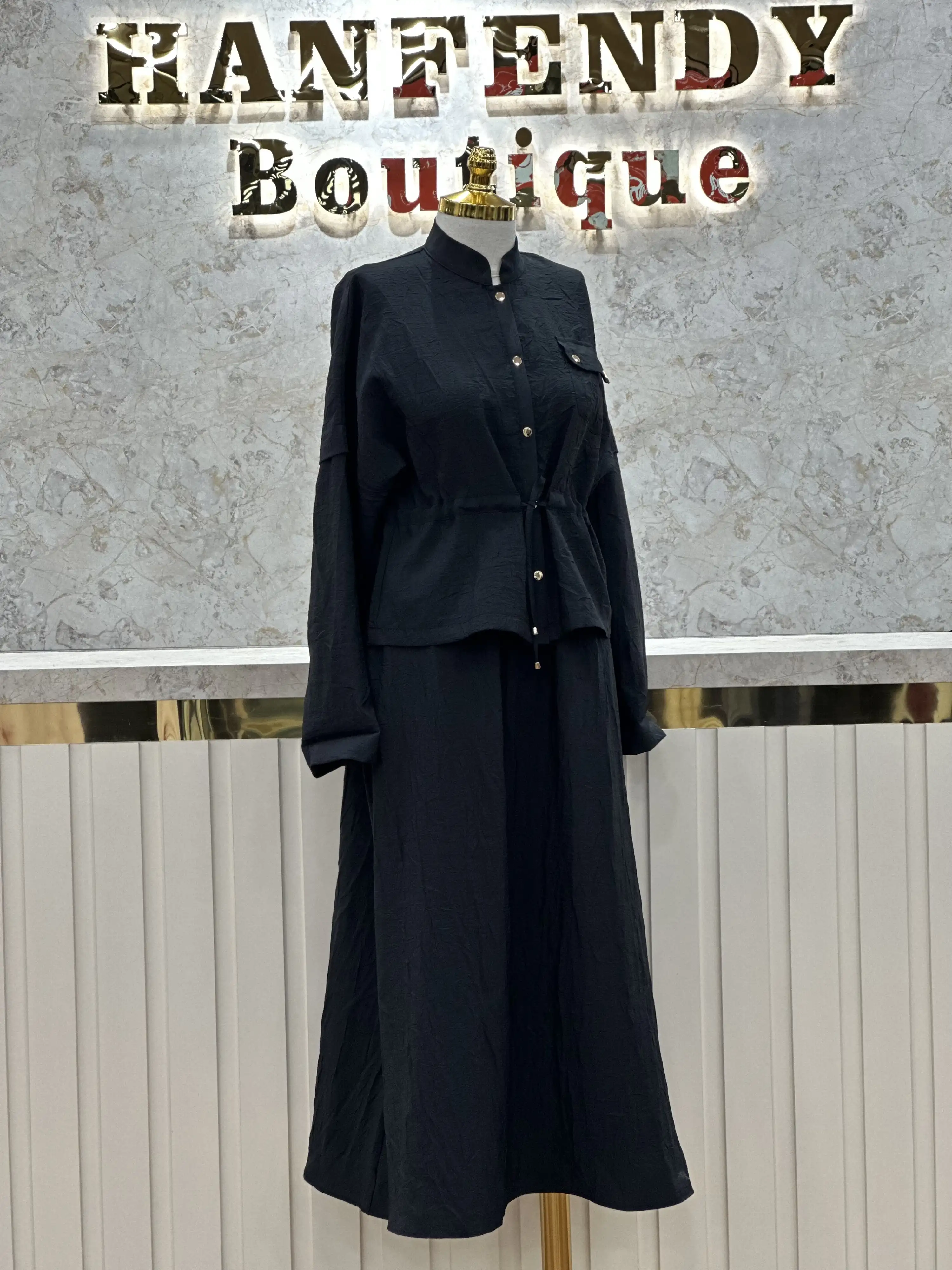 NUSS Siyah Renk Etekli Takım, tesettür giyimde şıklığı ve zarafeti bir arada sunuyor. Bu takım ile hem günlük şıklığınızı hem de özel günlerde şık ve rahat bir görünüm elde edebilirsiniz.