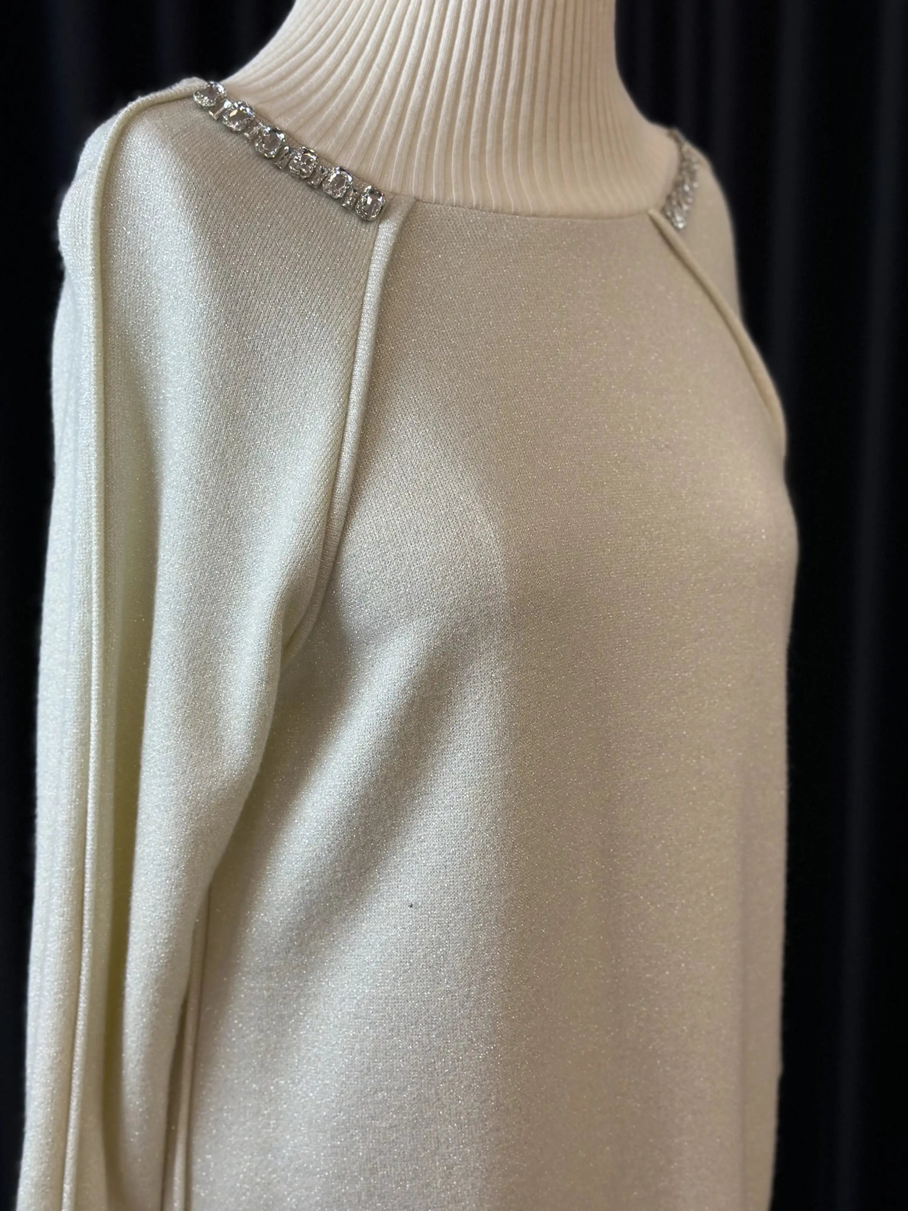 Qupra Simli Angora Ekru Renk Triko, kalitesi ve şıklığıyla öne çıkan bir parça olup gardırobunuzun vazgeçilmezleri arasında yerini alacak.
